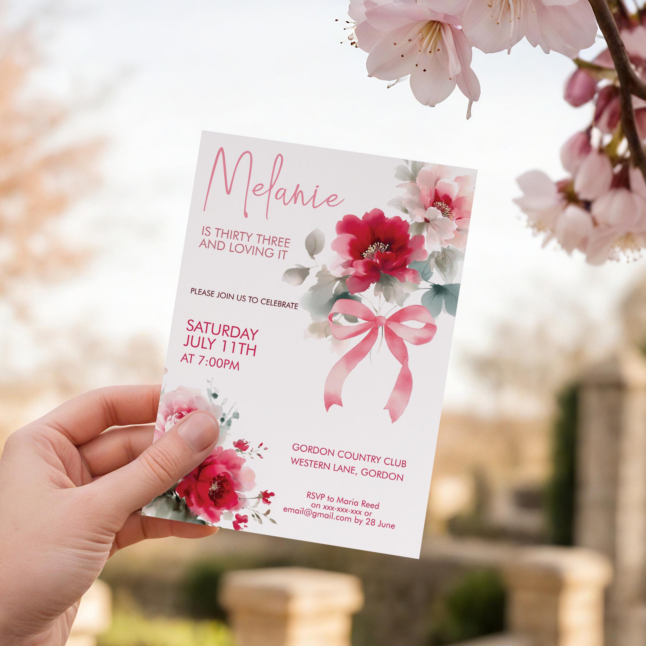 Red Floral Pink Bow Birthday Invitation White Template, Scarlet Editable Party Dinner Women, Any Age Flowers Invite