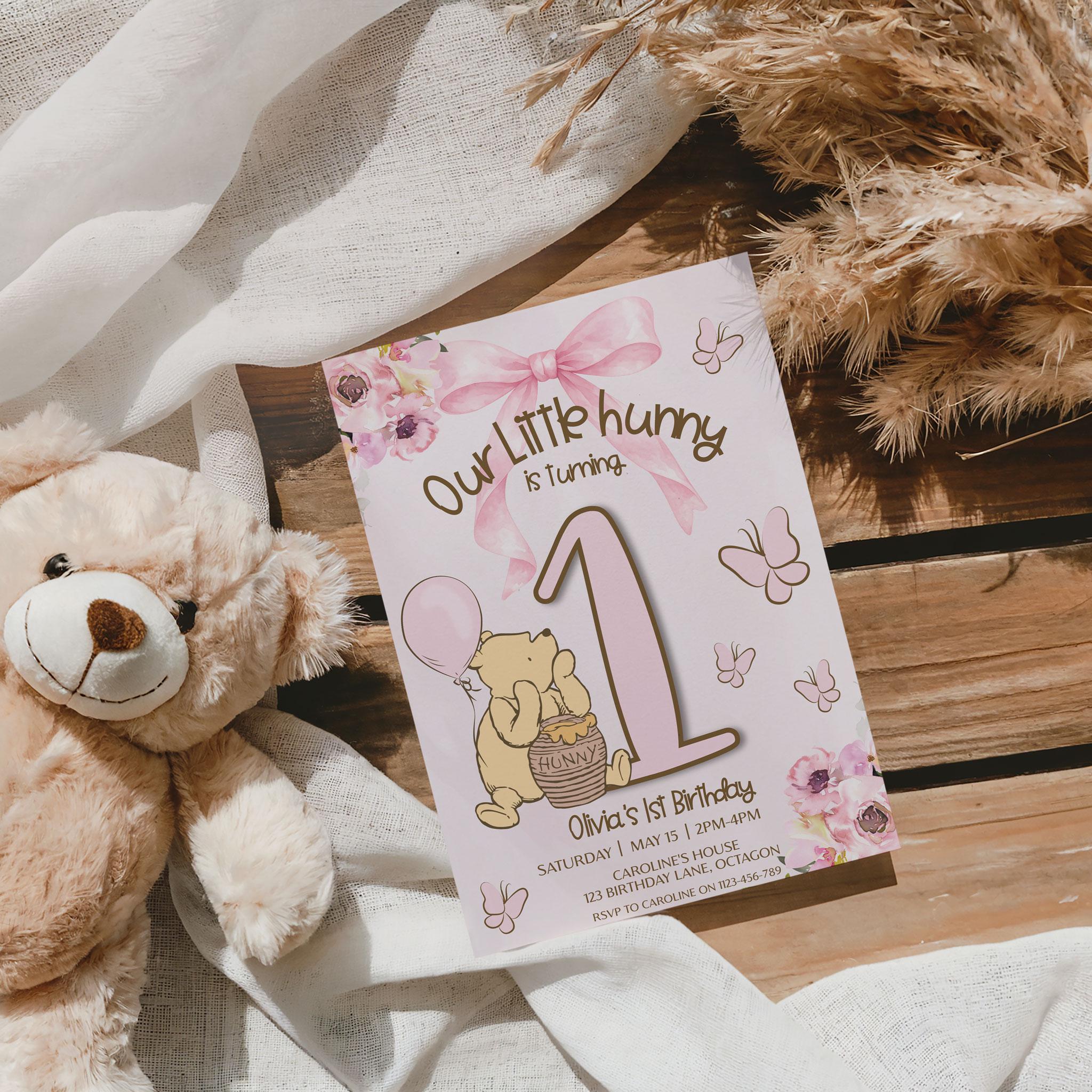 Winnie-the-pooh pink bow 1st Birthday Invitation: little hunny turning 1, honey pot (Printable Template)