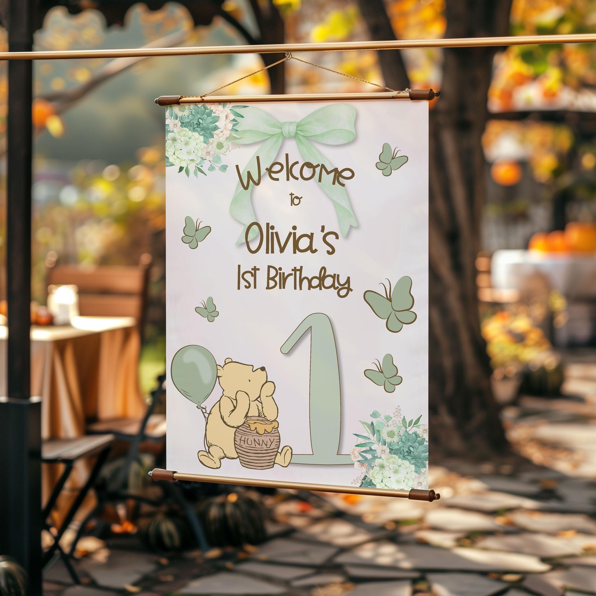 Classic Pooh green bow 1st Birthday Welcome Sign: hunny pot, little hunny turning 1, honey pot (Printable Template)