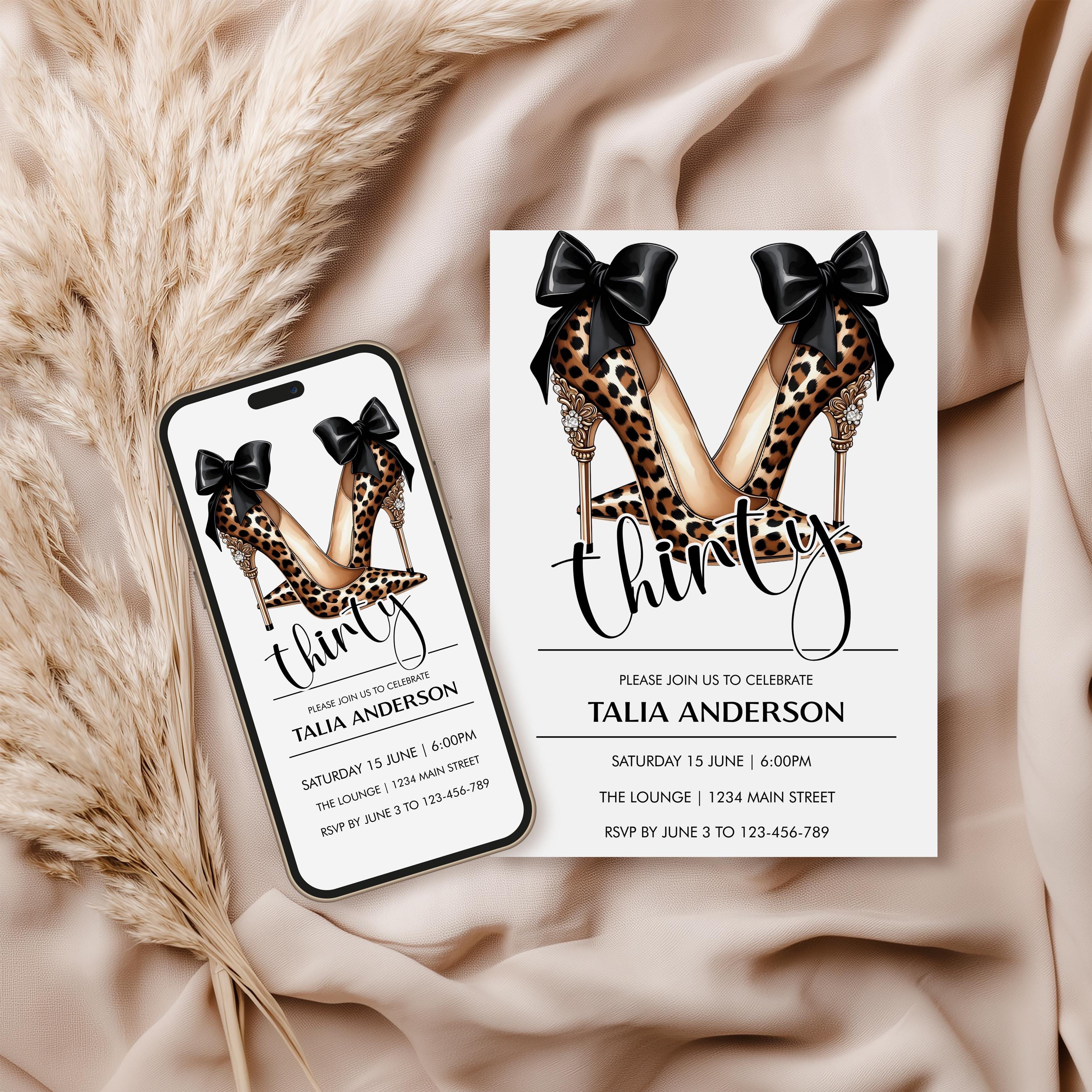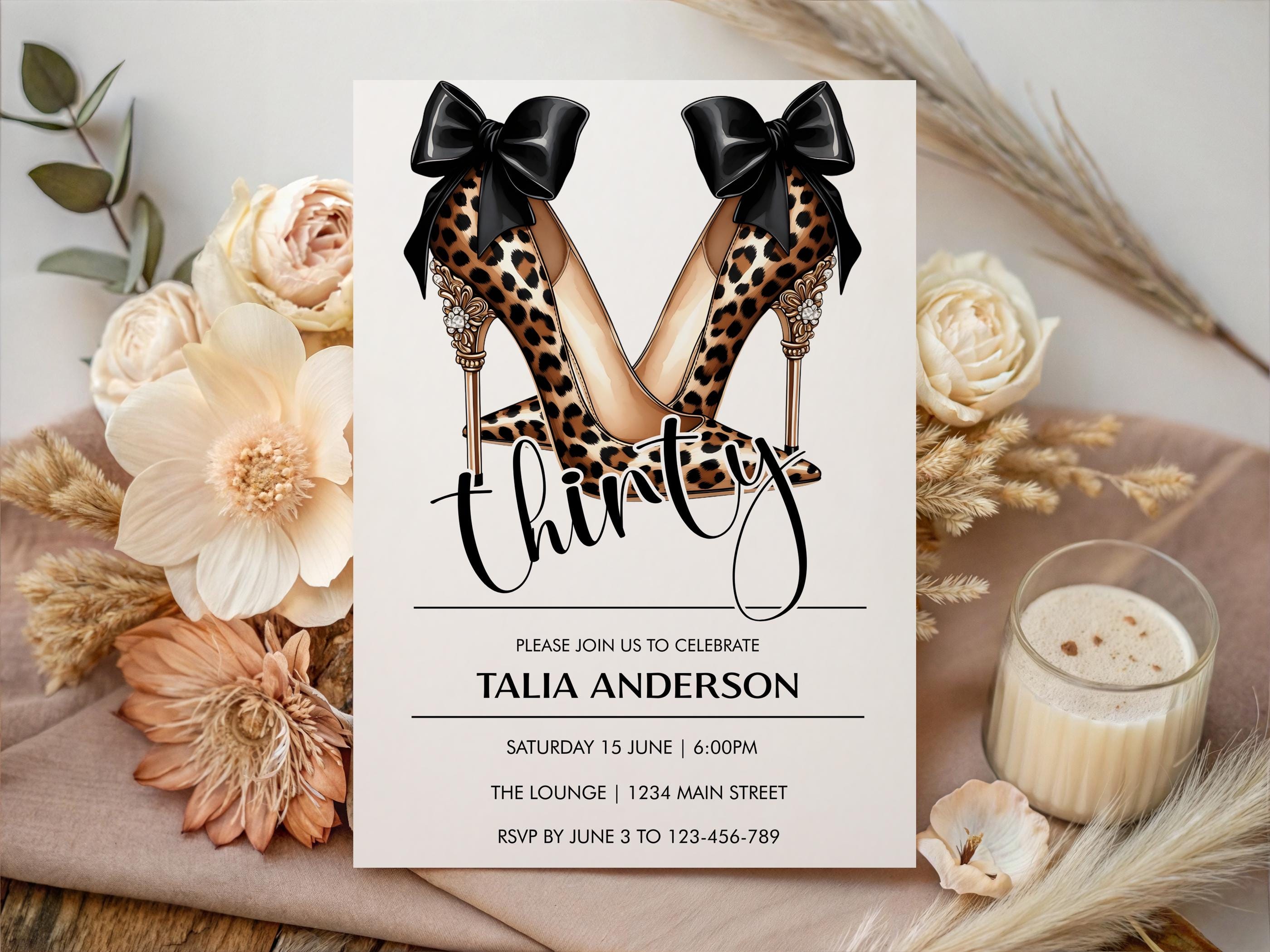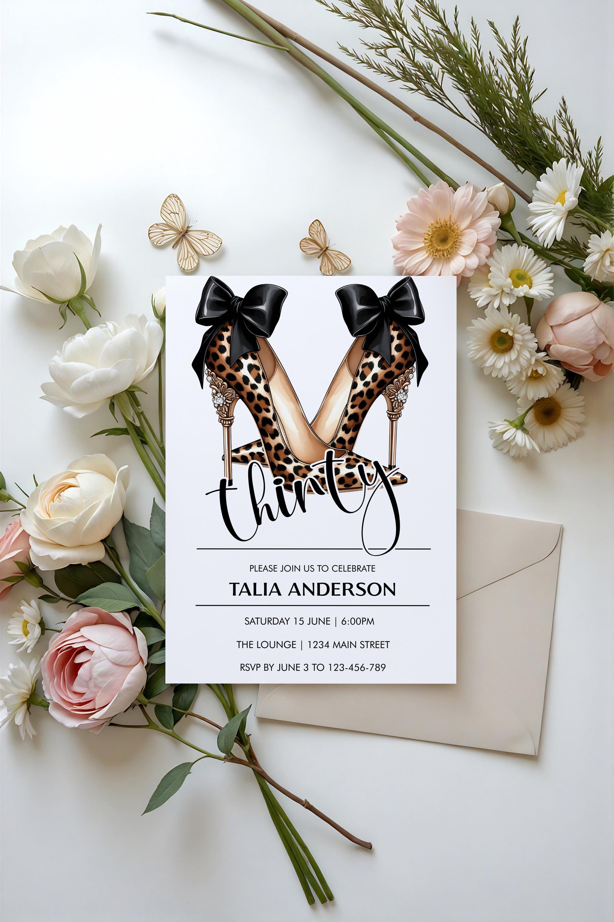 Celebrate in style! This editable 30th birthday black bow leopard high heels invitation features bold black typography on a crisp white background perfect for a chic, modern party. Easily customize name, date, time and location - then download and print or send digitally. You can even change the thirty to a different number!
