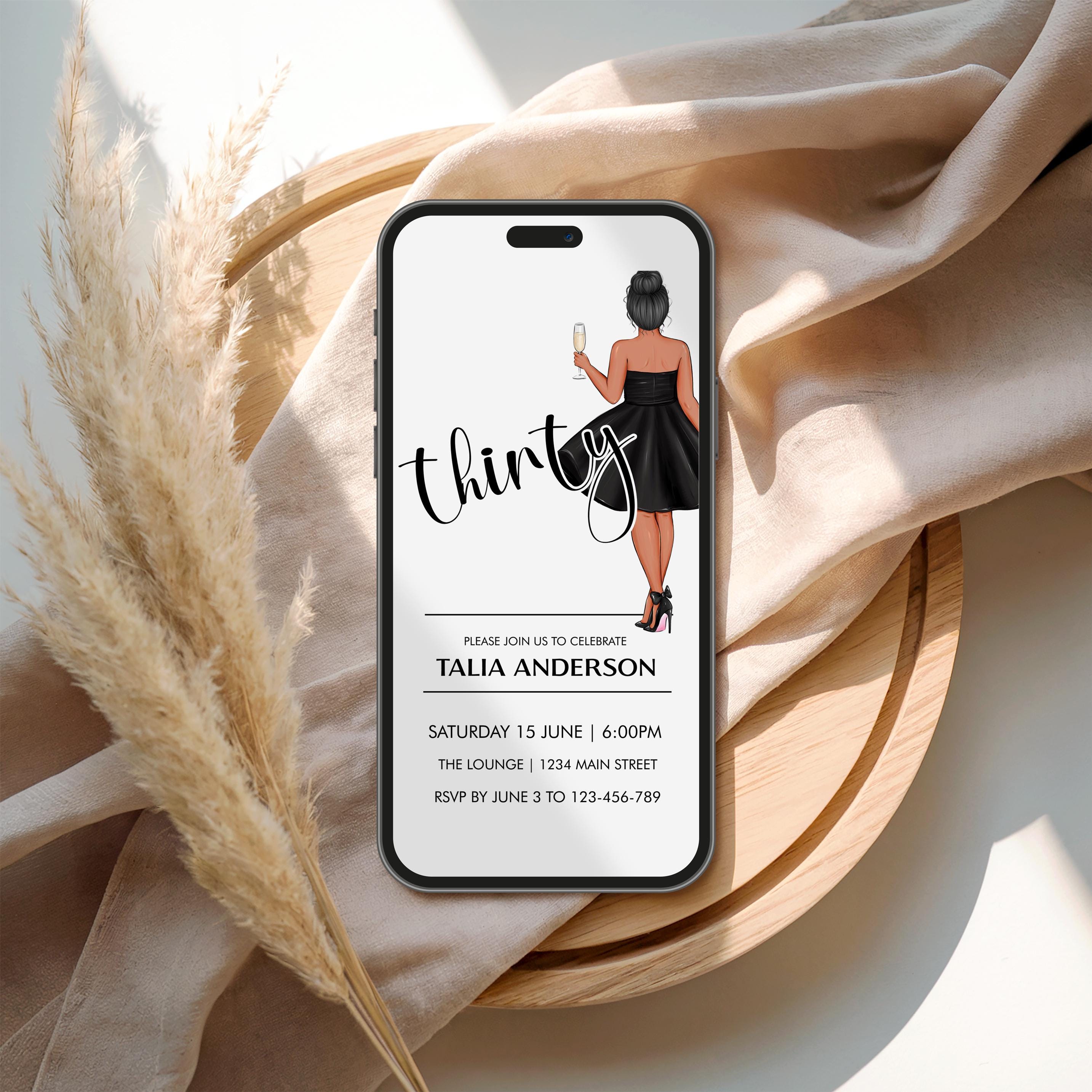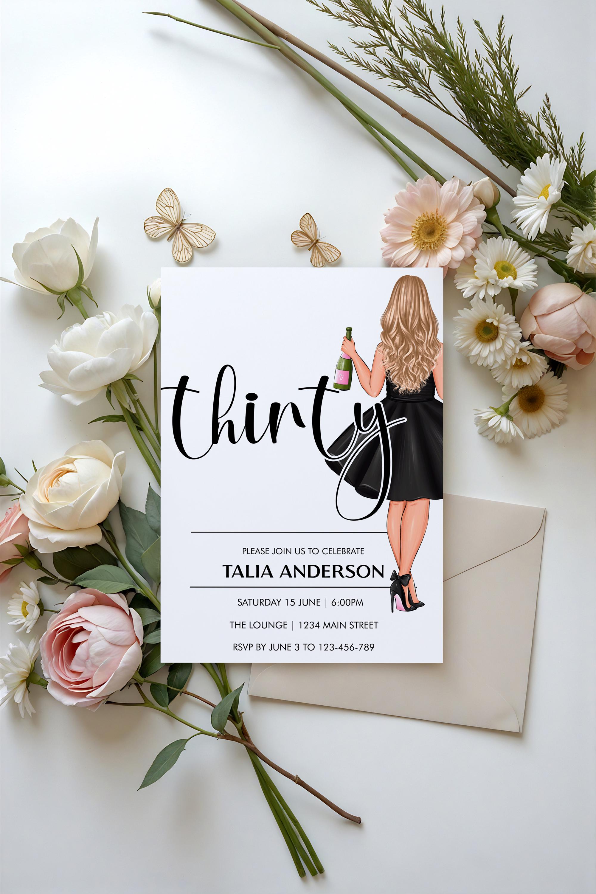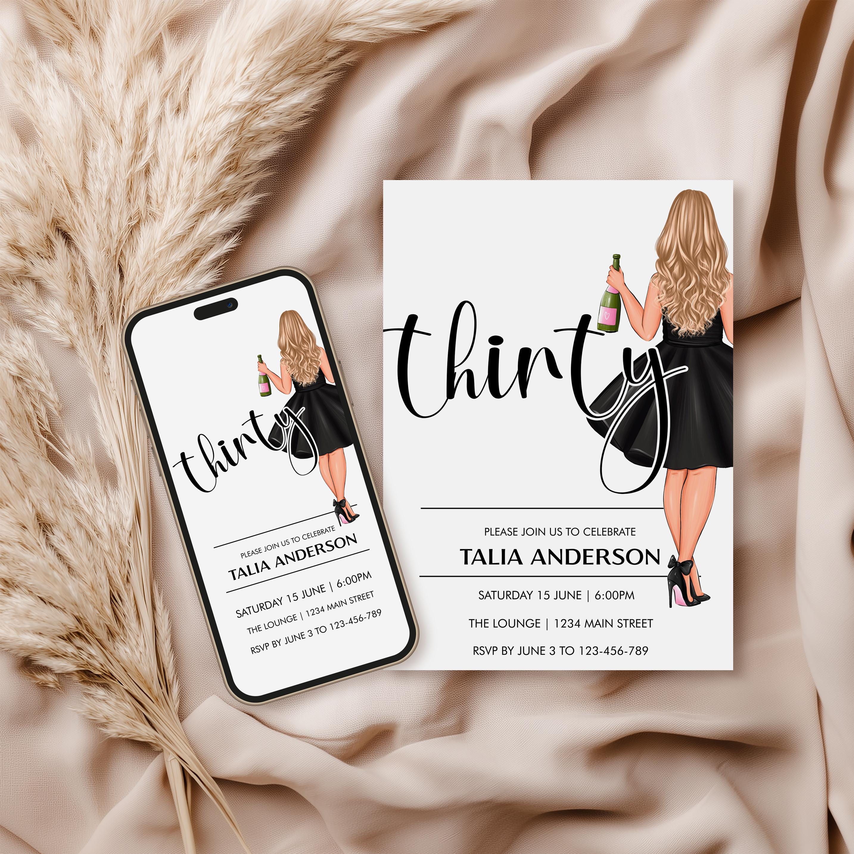 Celebrate in style! This editable 30th birthday black bow Champagne Girl Drinks invitation features bold black typography on a crisp white background perfect for a chic, modern party. Easily customize name, date, time and location - then download and print or send digitally. You can even change the thirty to a different number! Choose from 12 different girls.