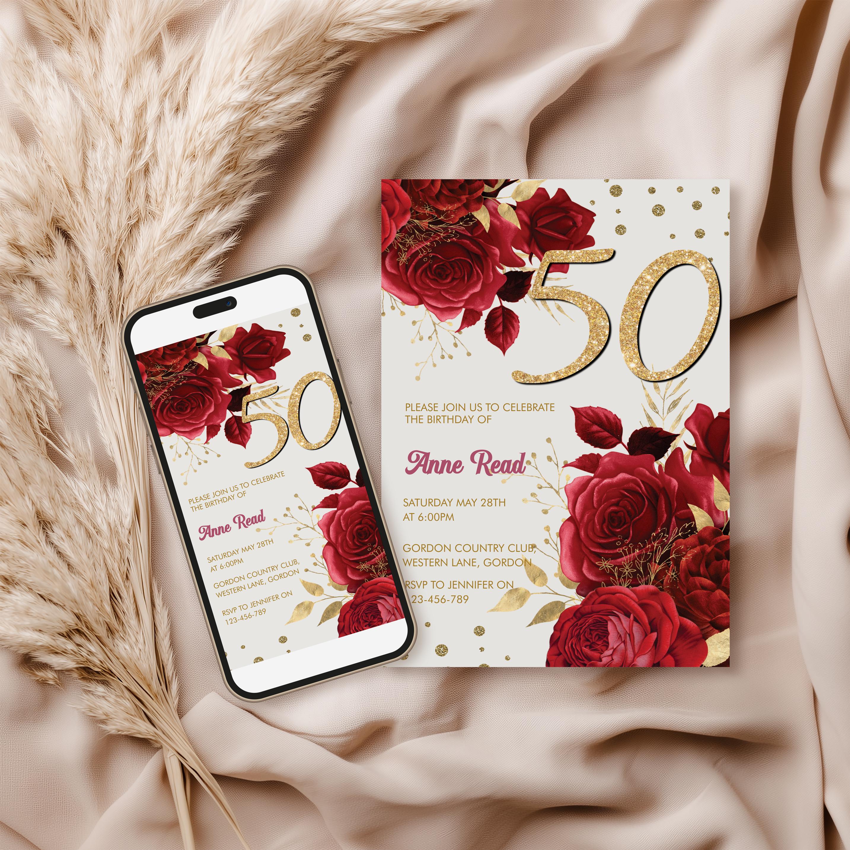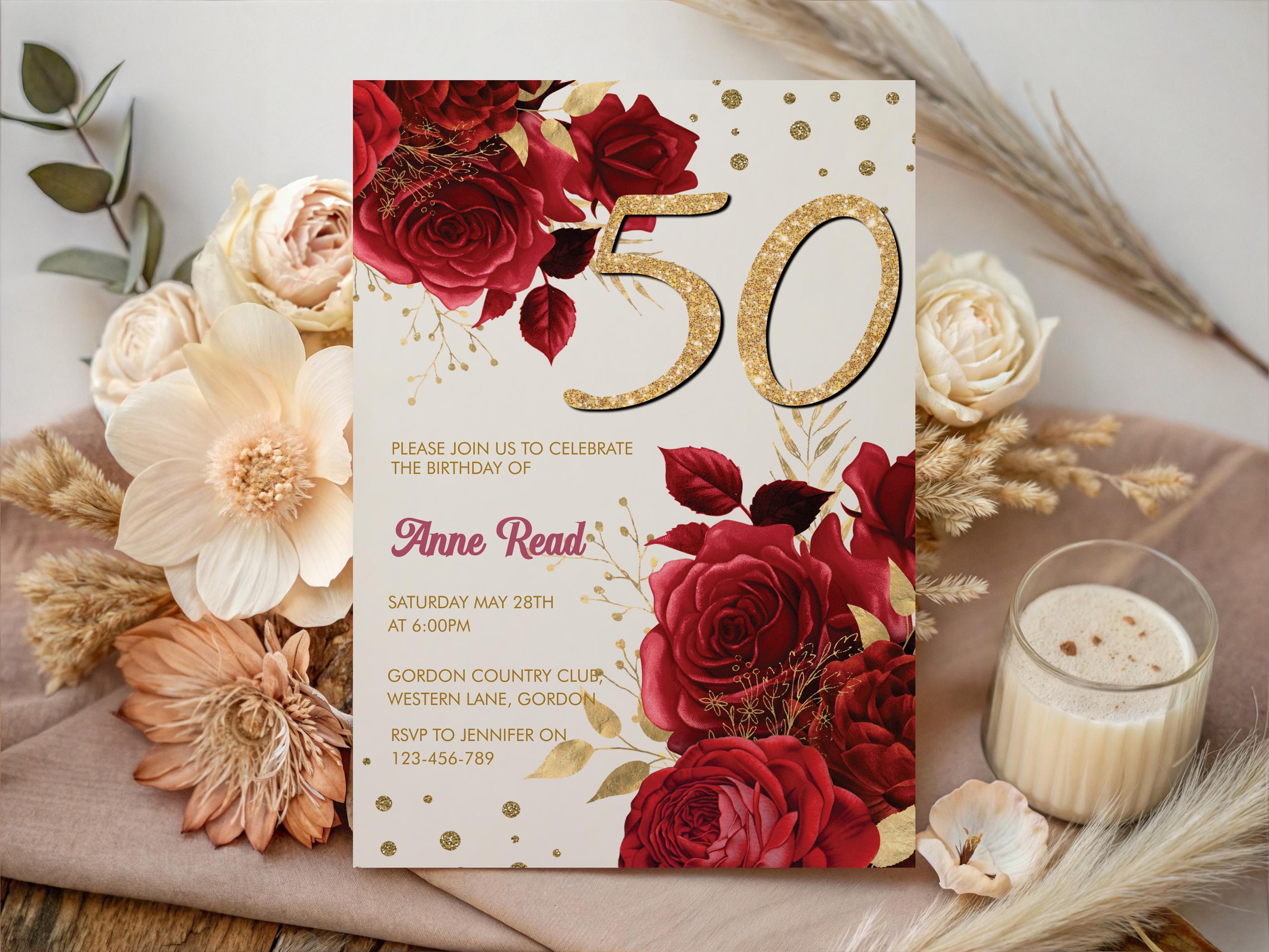 50th Red Floral Birthday Invitation template - Editable Printable 5x7 - Gold Glitter Number Invite - Instant Download with bonus phone invite!