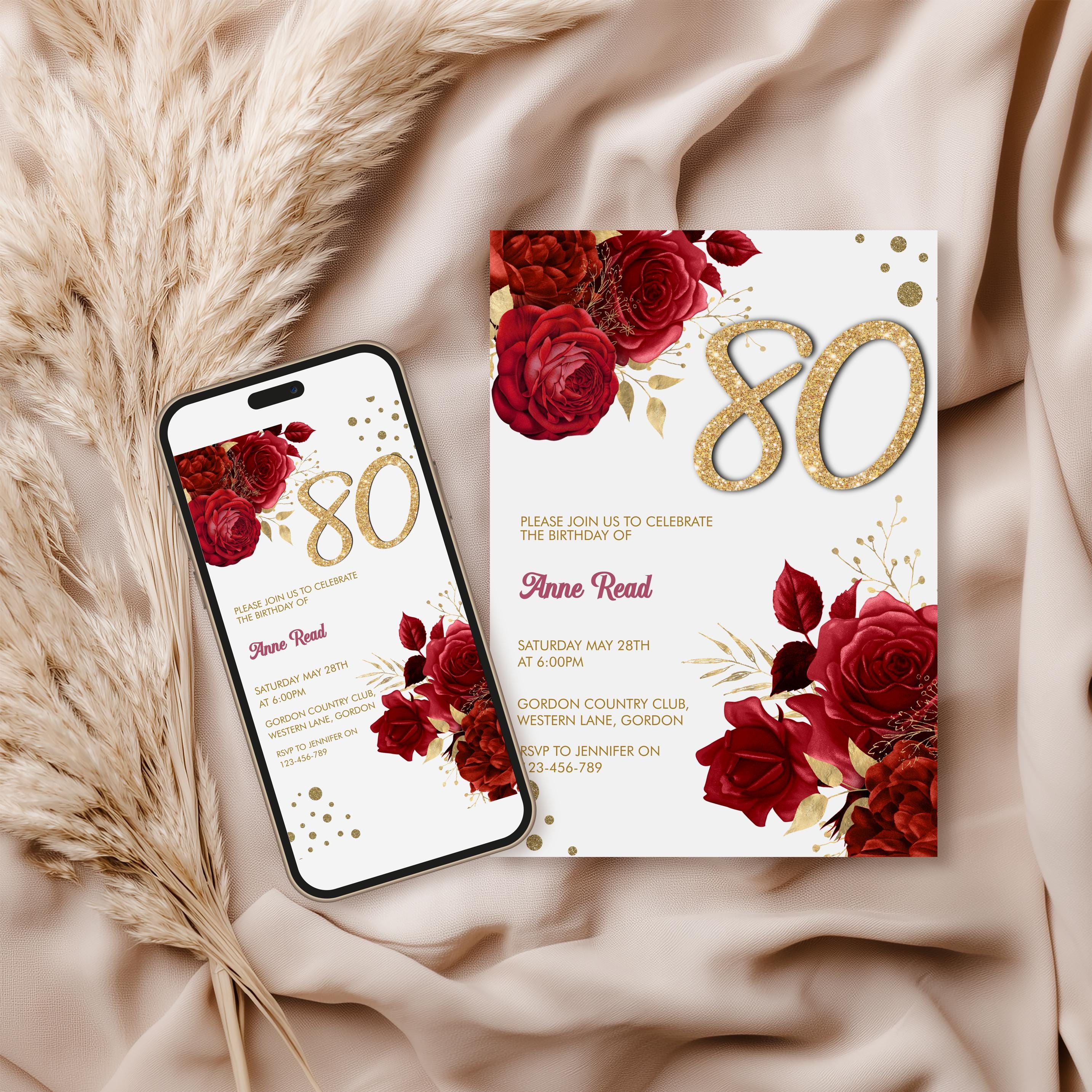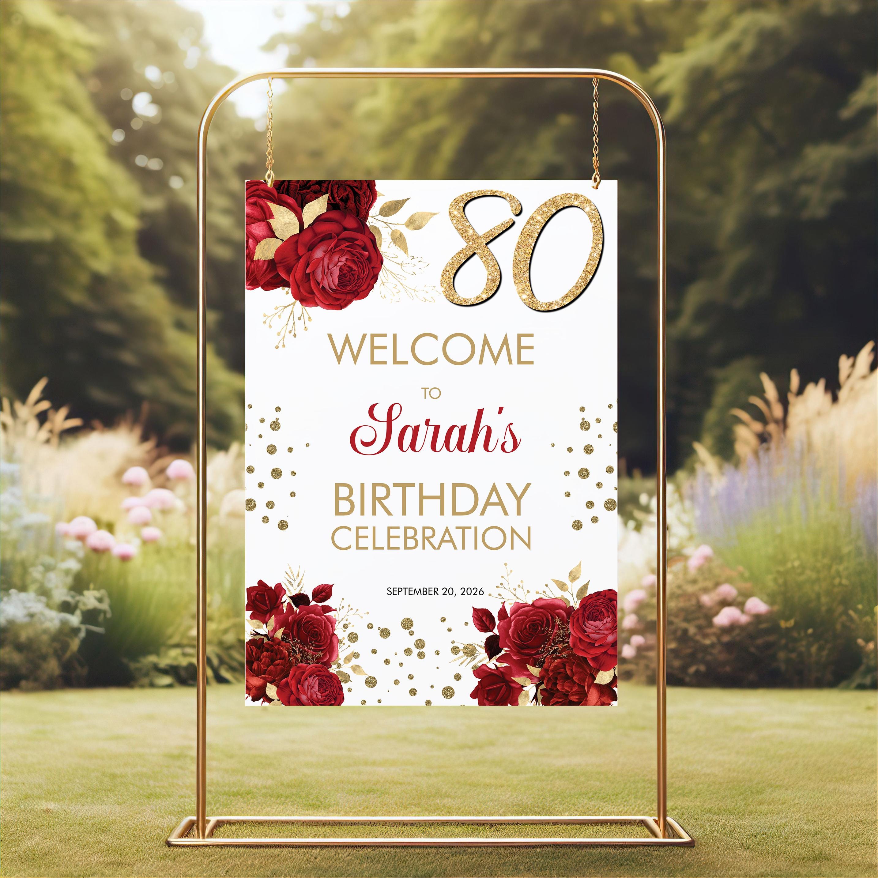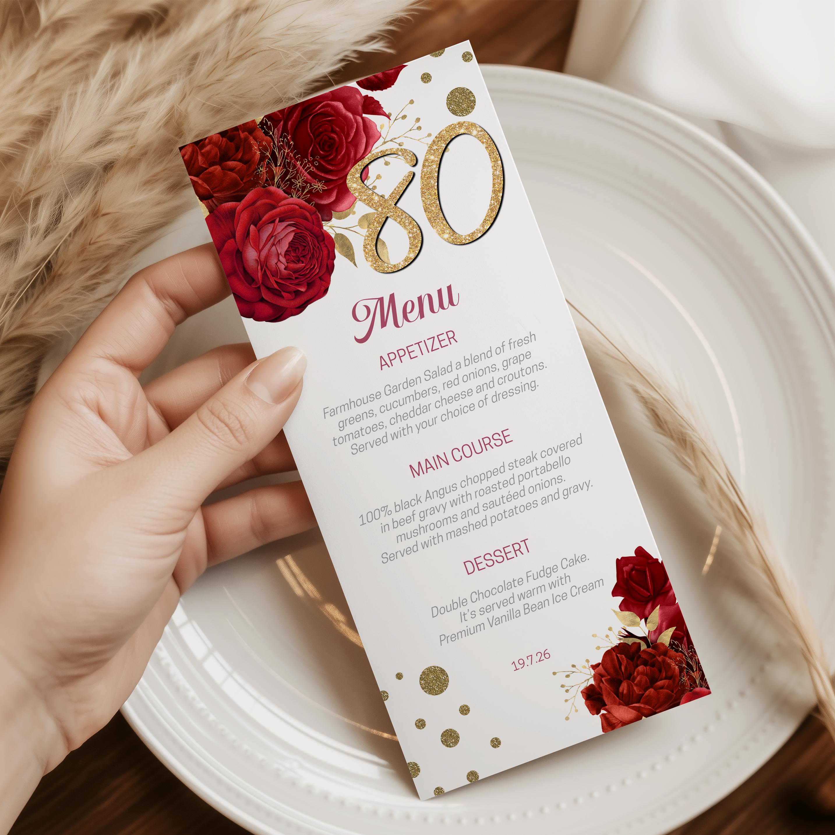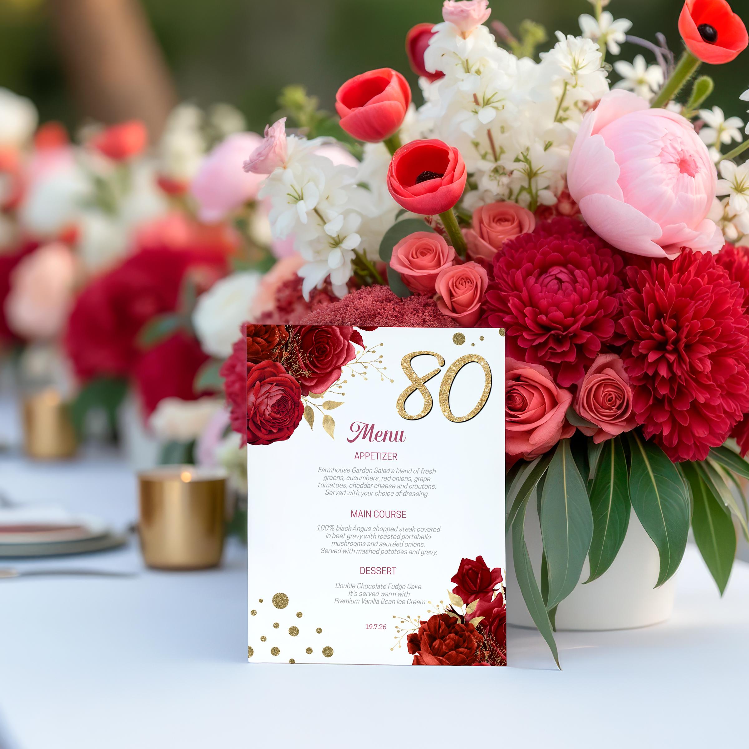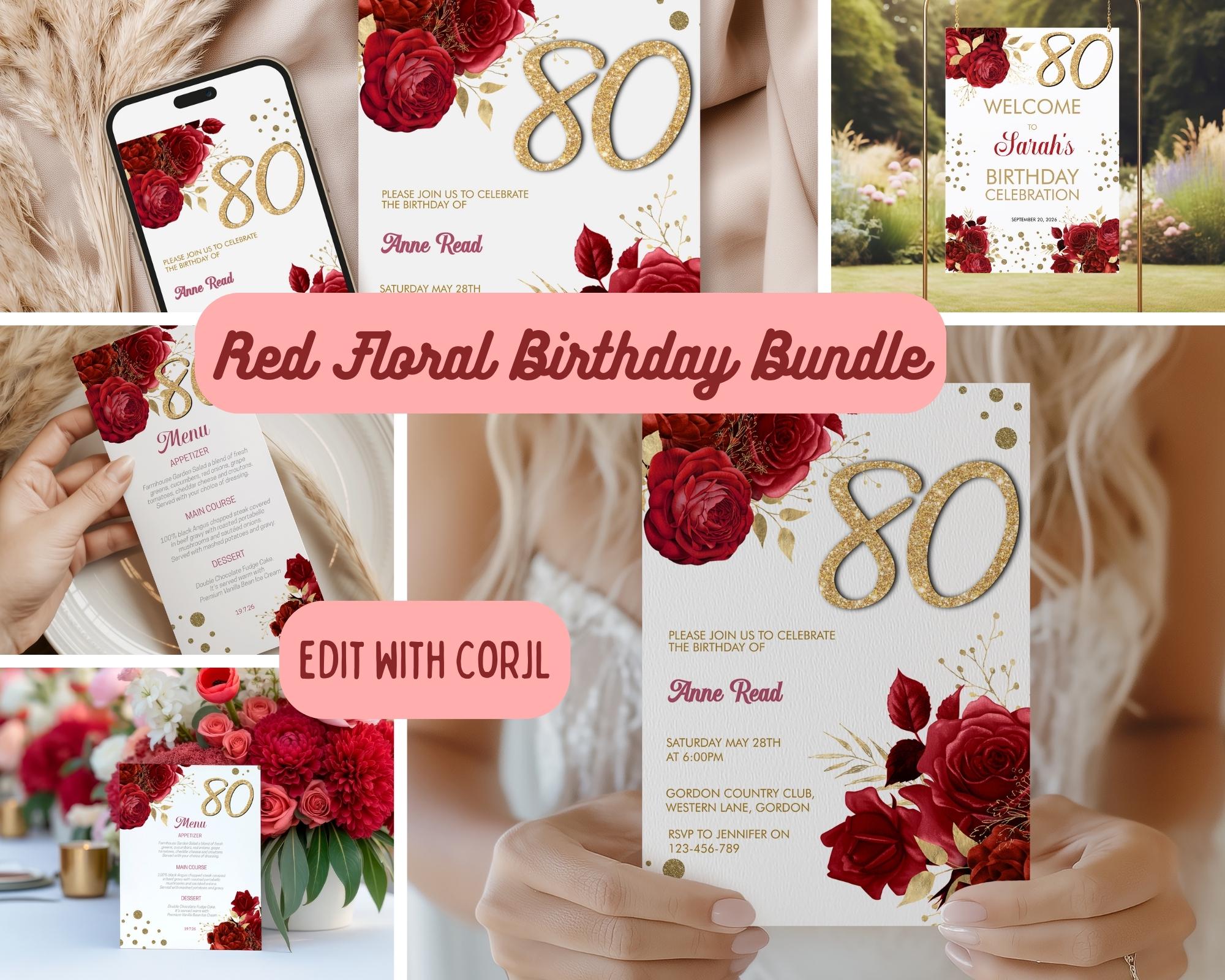 Red Floral Birthday Invitation template along with a phone template, welcome sign, 2 x sizes of menu!