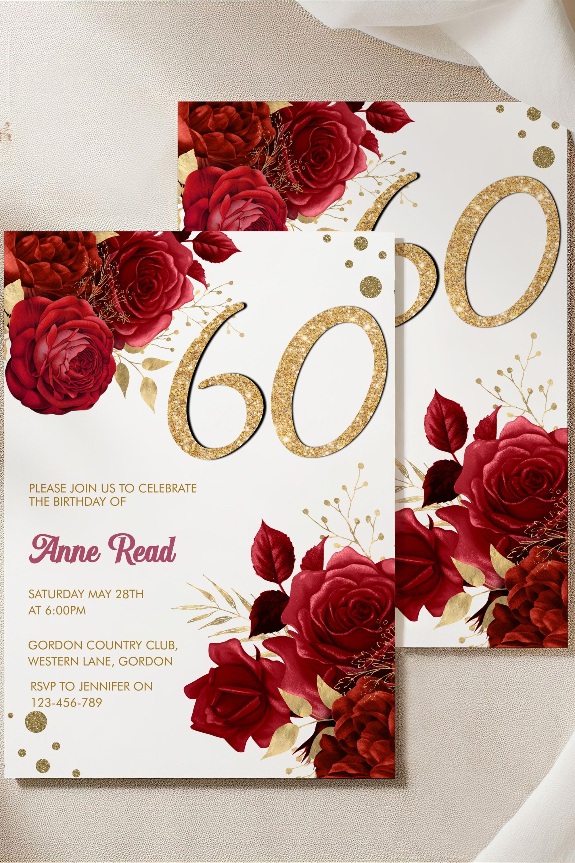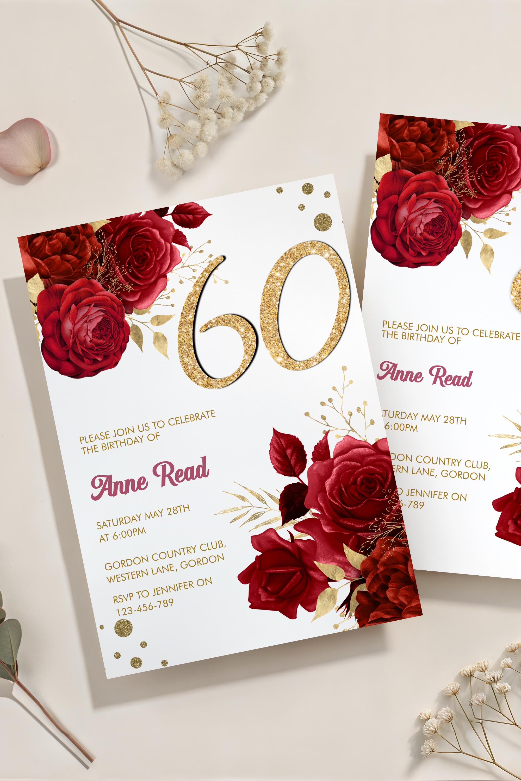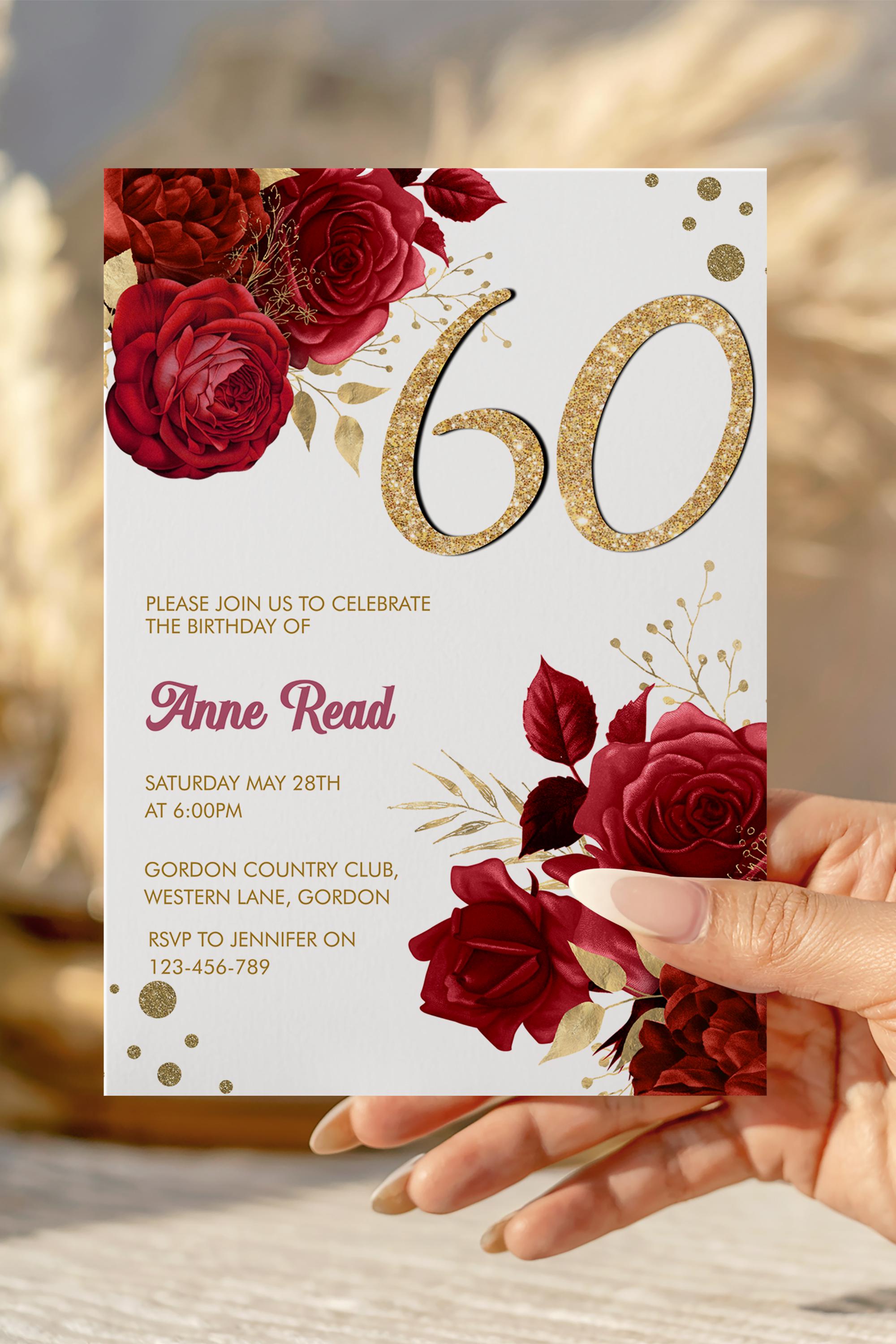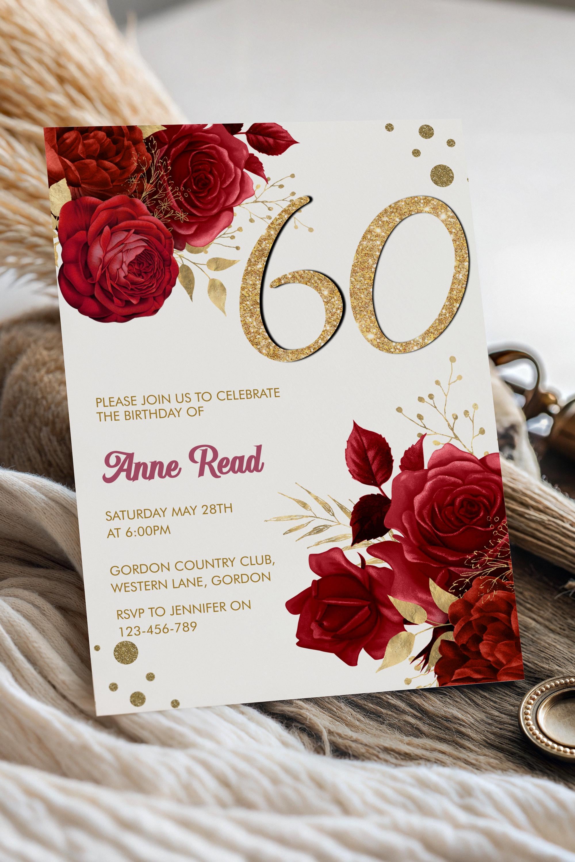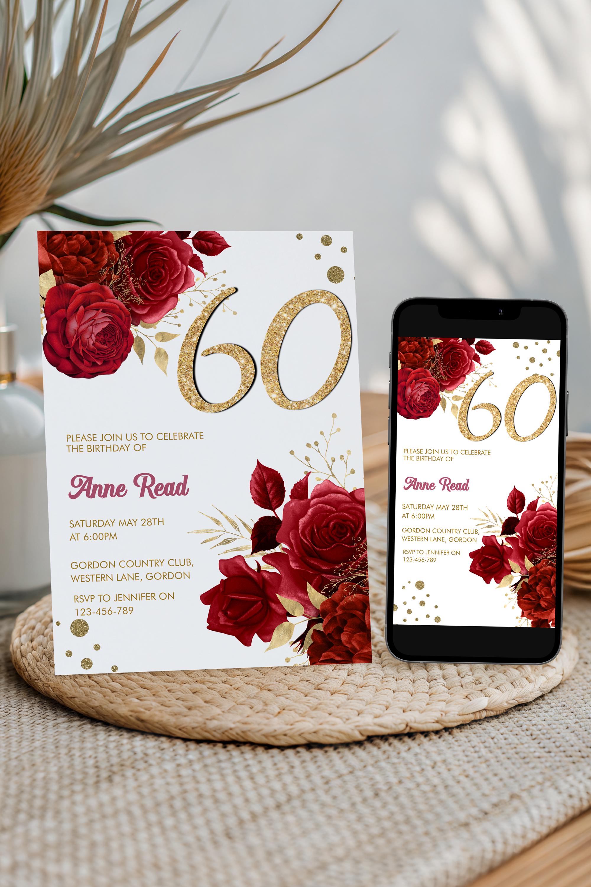 Bring a touch of heart and elegance to your celebration with this red floral 60th birthday invitation, designed to make a big impact in a small, meaningful way. The rich florals and gold‑glitter number create a warm, celebratory feel that helps you stage your event beautifully — without the stress. Edit instantly in Corjl and personalize your invitation with ease, so your special day feels intentional, joyful, and effortlessly stunning.