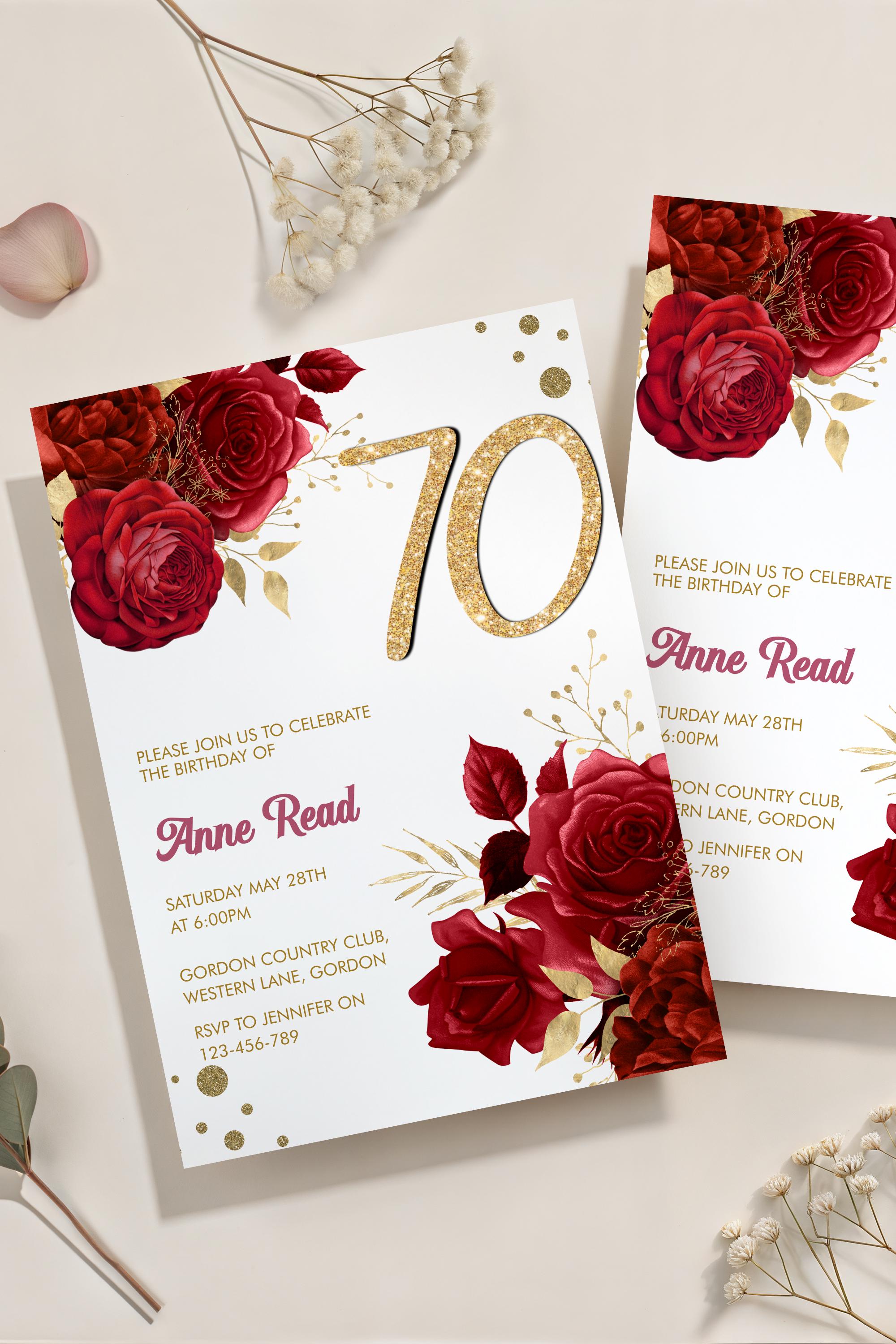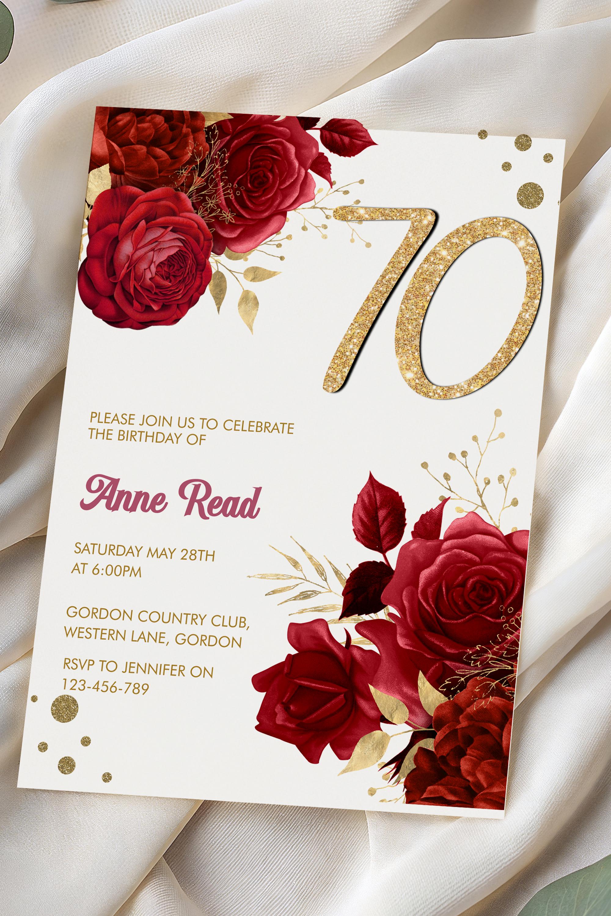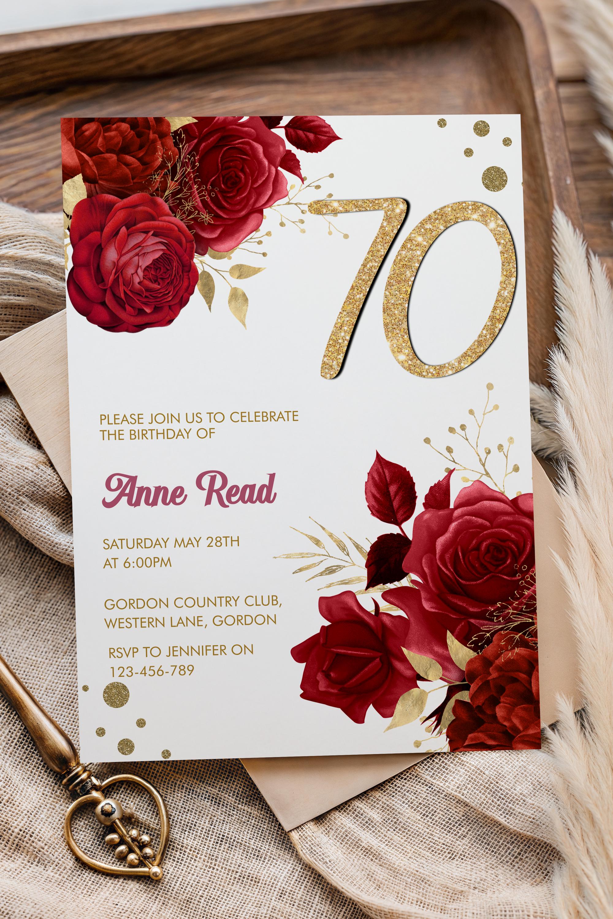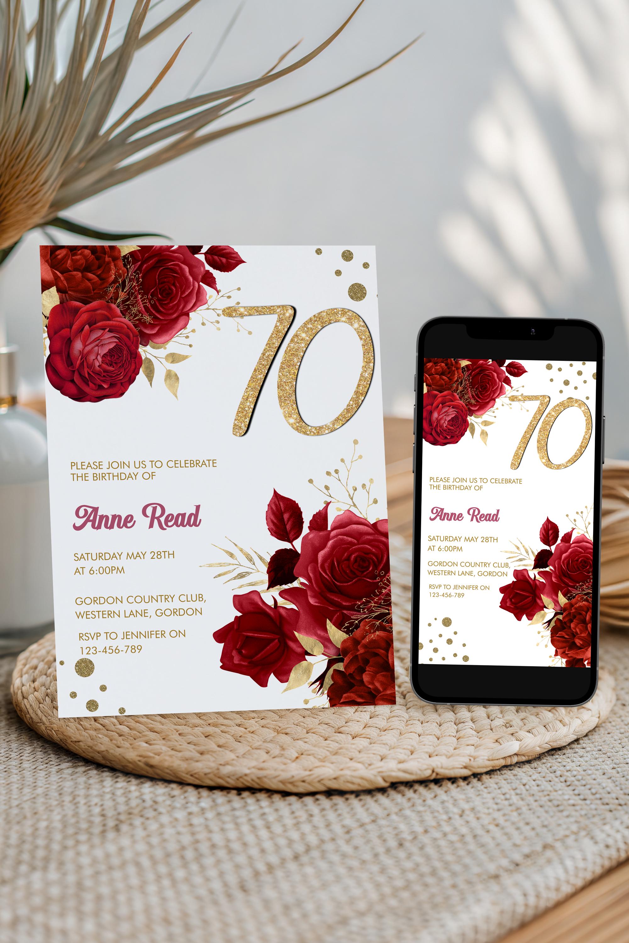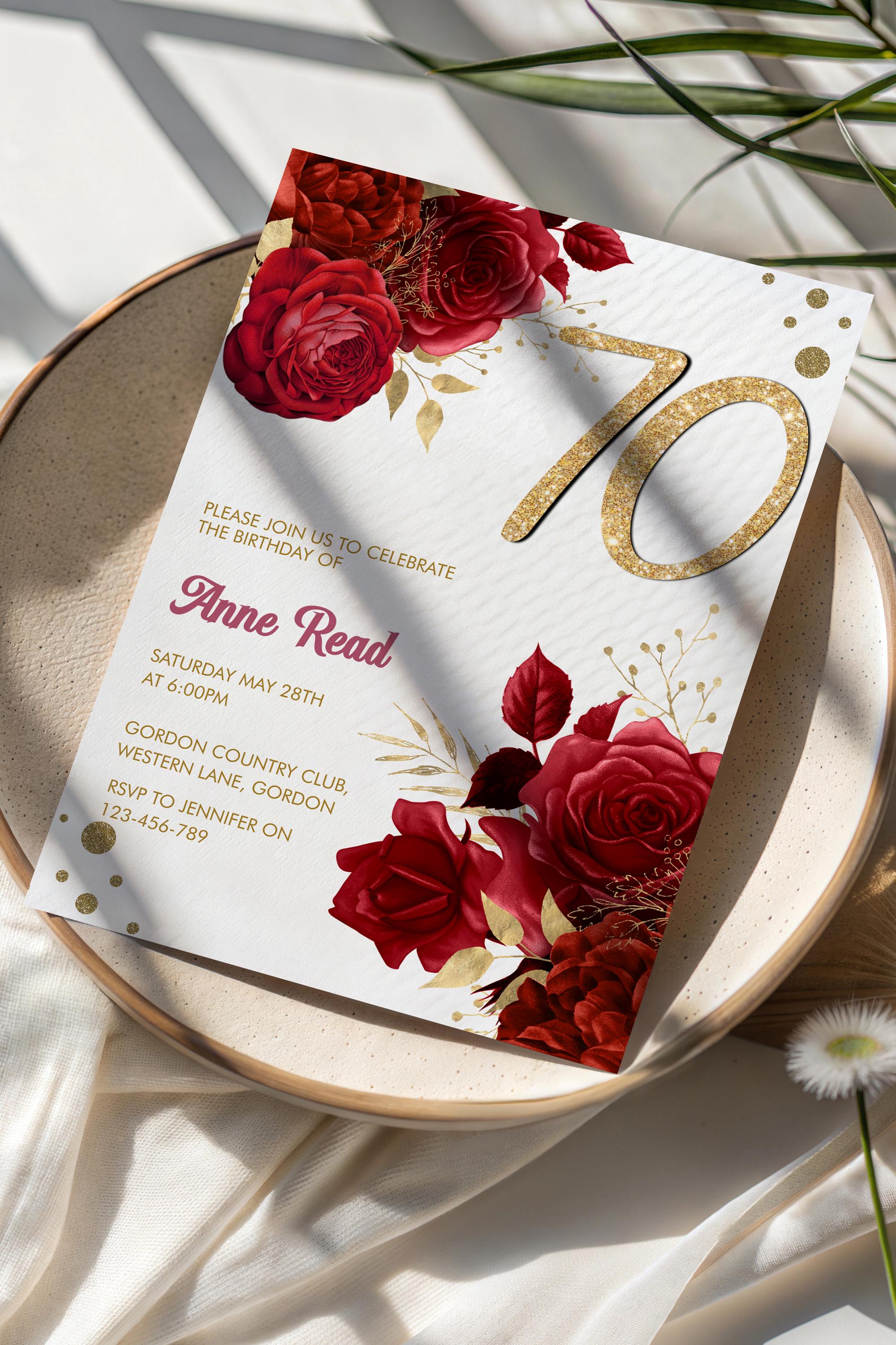 Bring a touch of heart and elegance to your celebration with this red floral 70th birthday invitation, designed to make a big impact in a small, meaningful way. The rich florals and gold‑glitter number create a warm, celebratory feel that helps you stage your event beautifully — without the stress. Edit instantly in Corjl and personalize your invitation with ease, so your special day feels intentional, joyful, and effortlessly stunning.