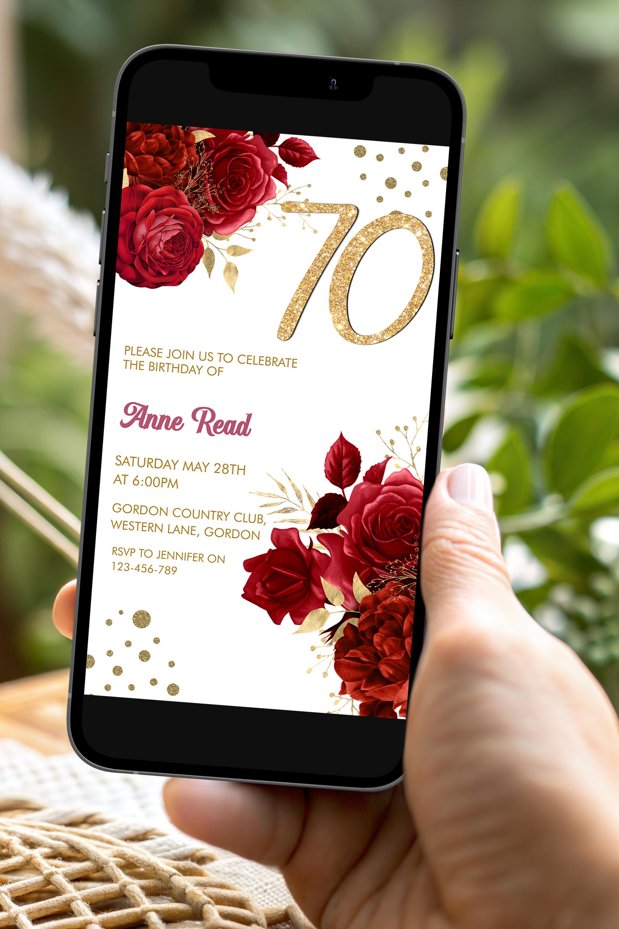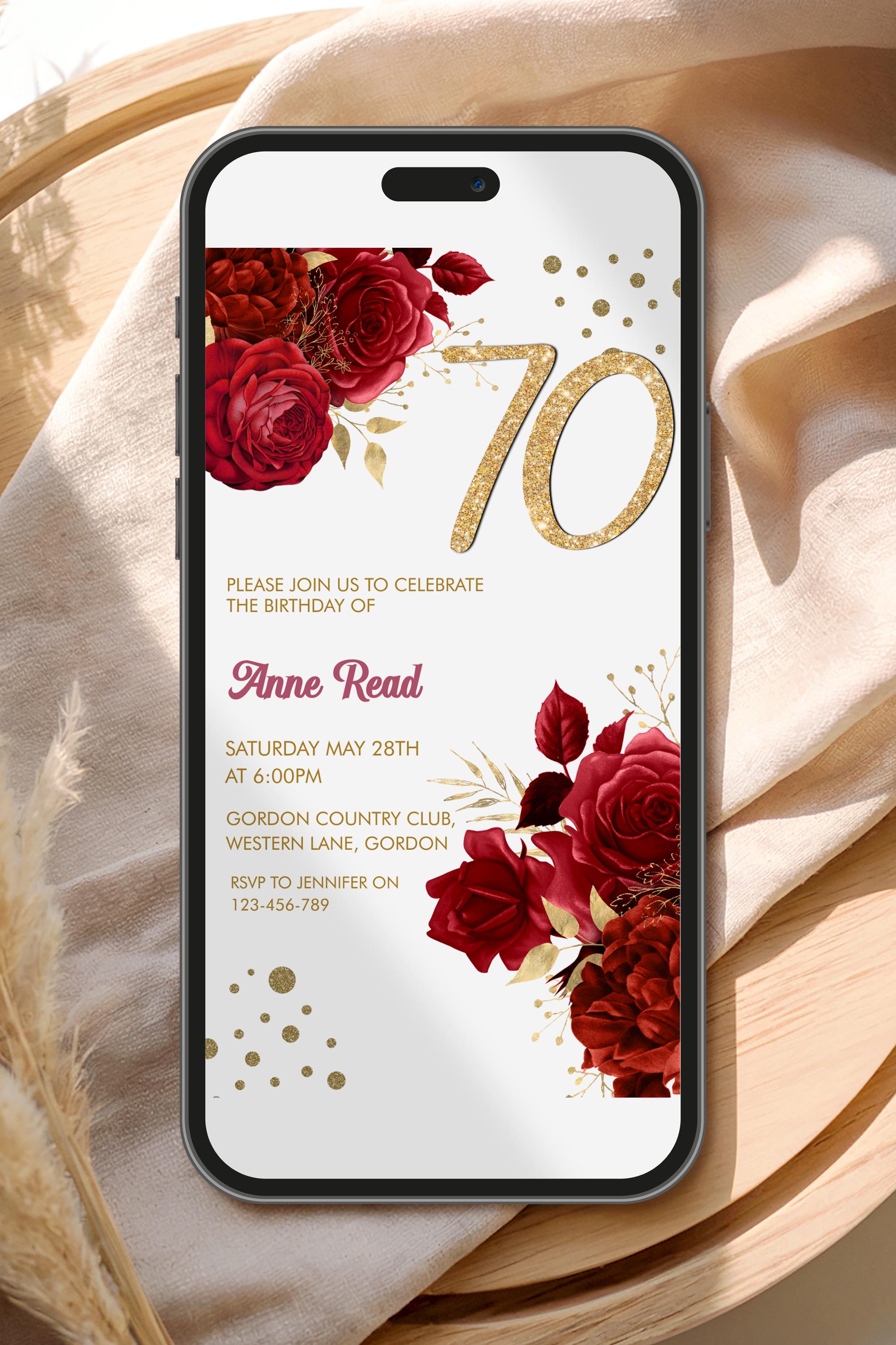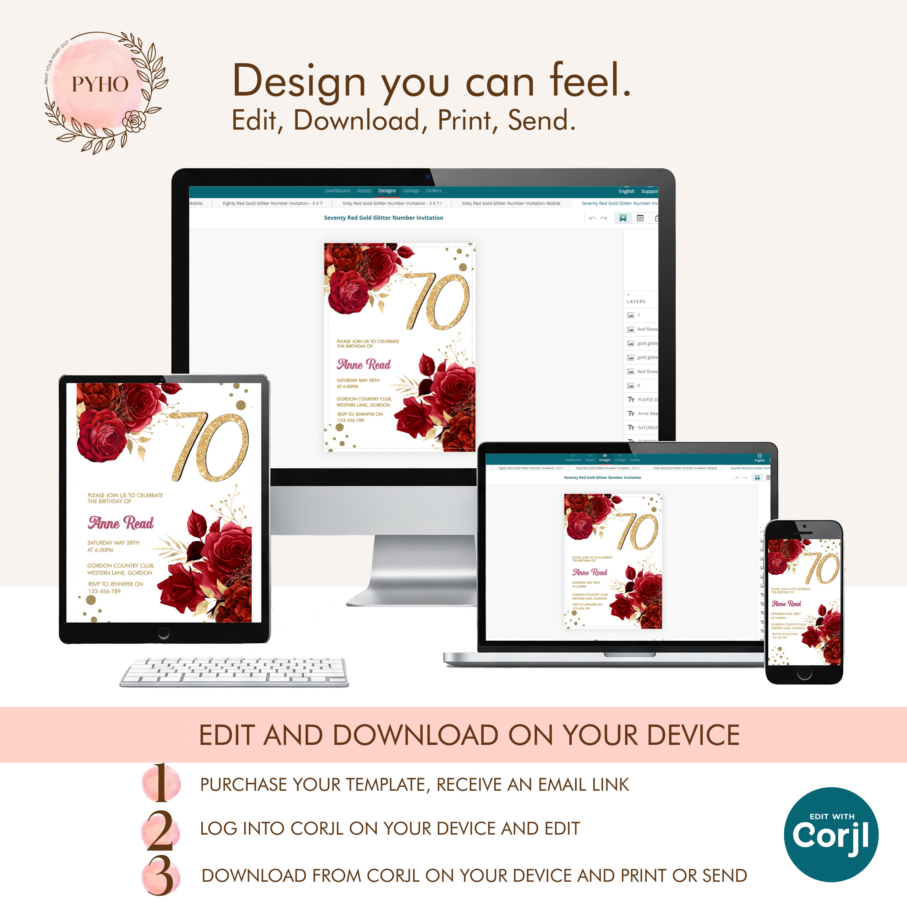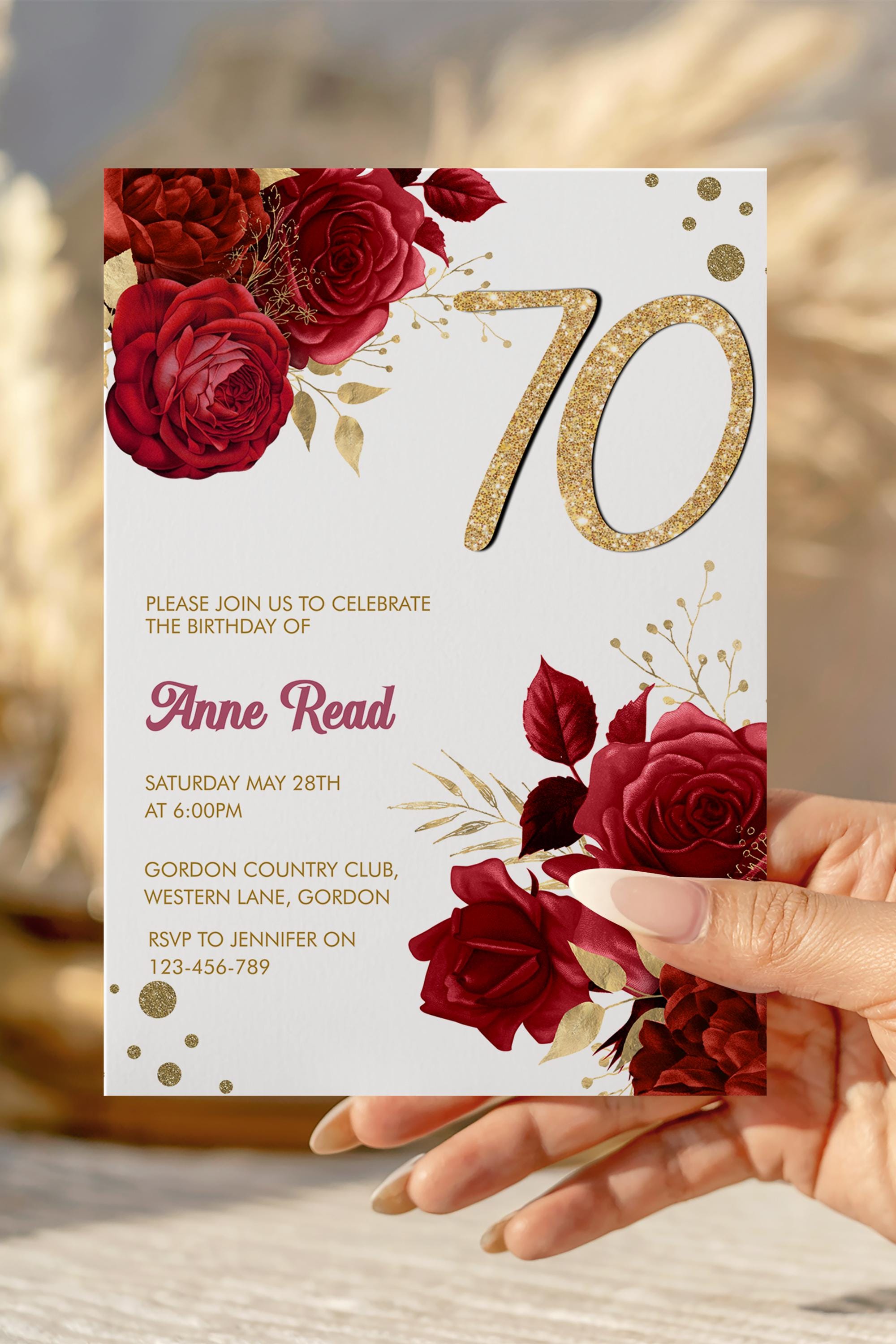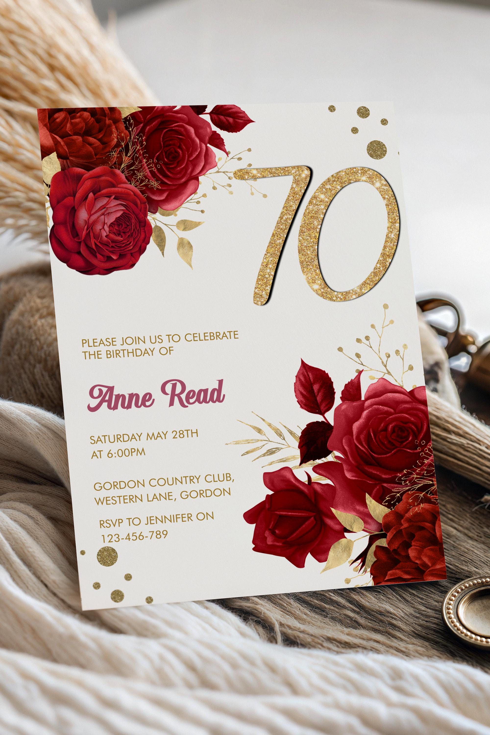 Bring a touch of heart and elegance to your celebration with this red floral 70th birthday invitation, designed to make a big impact in a small, meaningful way. The rich florals and gold‑glitter number create a warm, celebratory feel that helps you stage your event beautifully — without the stress. Edit instantly in Corjl and personalize your invitation with ease, so your special day feels intentional, joyful, and effortlessly stunning.