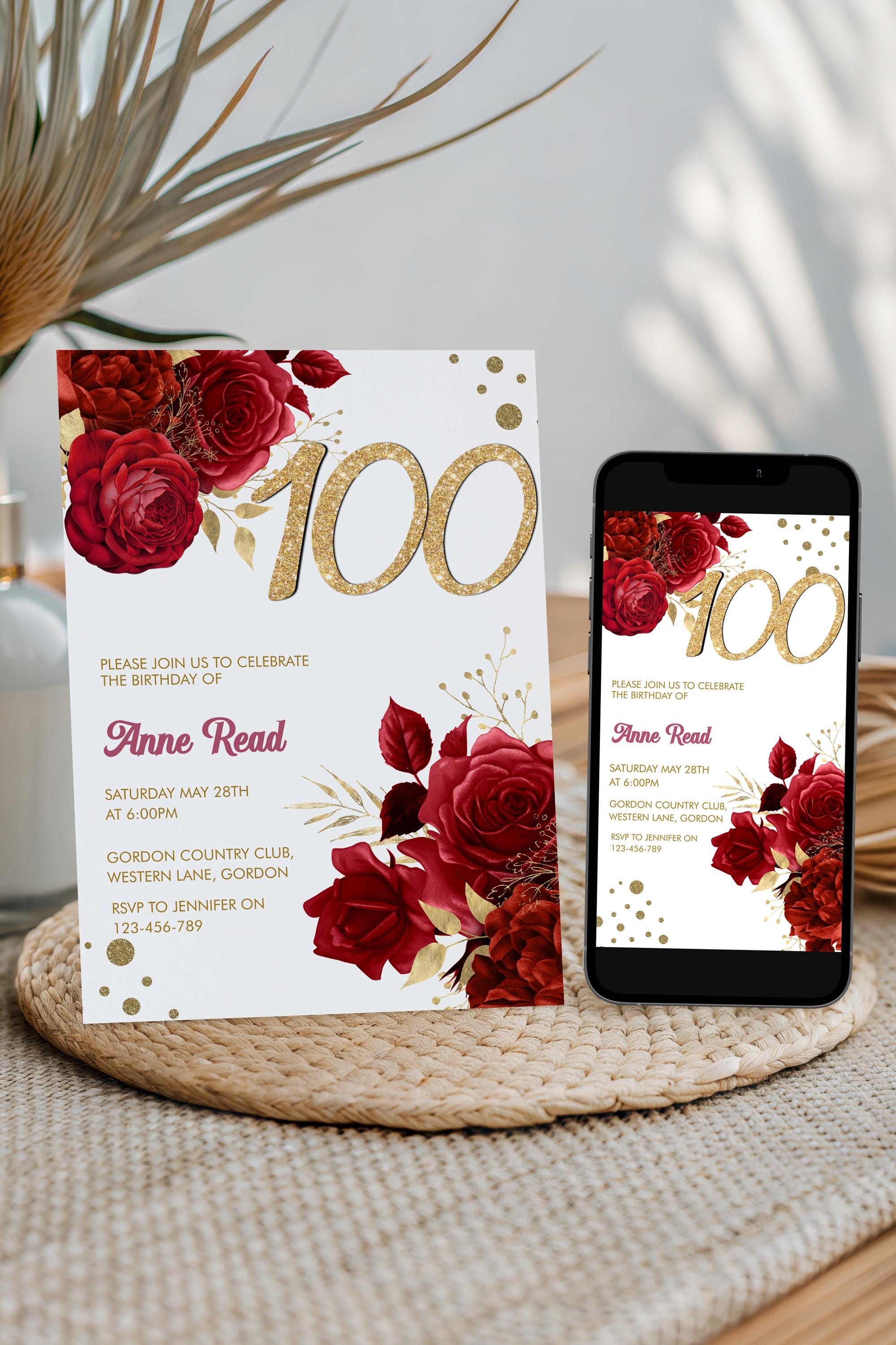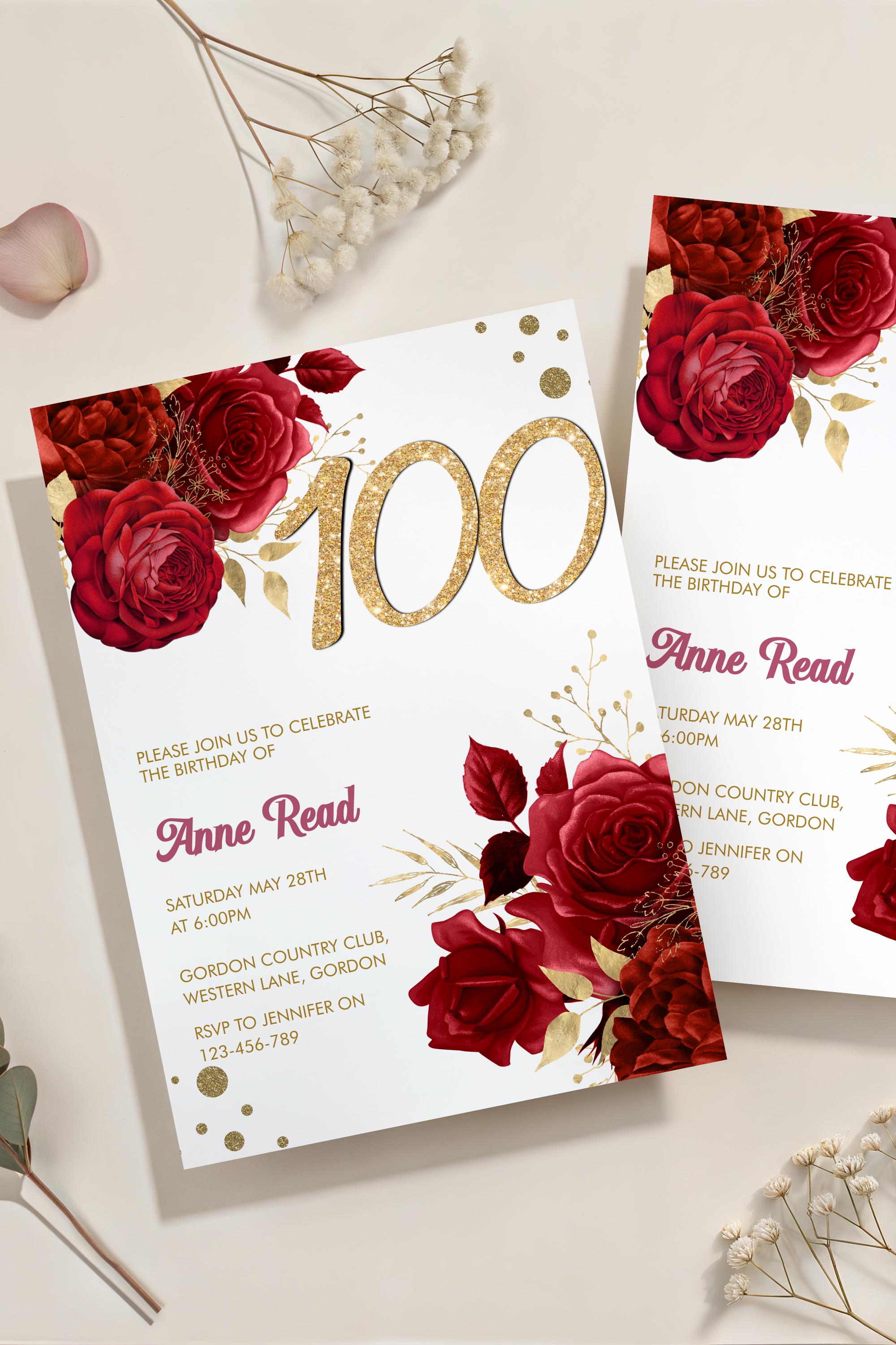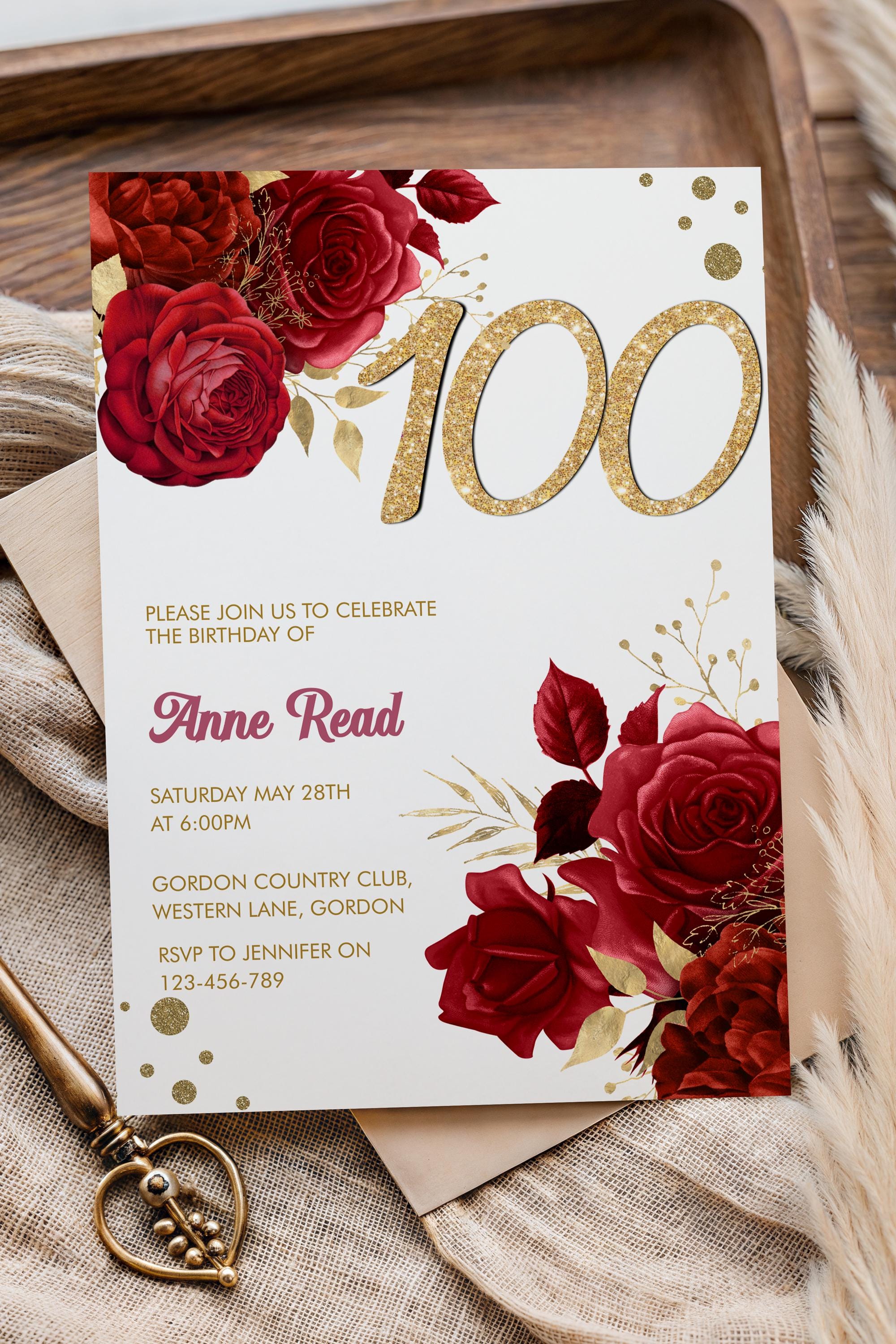 Bring a touch of heart and elegance to your celebration with this red floral 100th birthday invitation, designed to make a big impact in a small, meaningful way. The rich florals and gold‑glitter number create a warm, celebratory feel that helps you stage your event beautifully — without the stress. Edit instantly in Corjl and personalize your invitation with ease, so your special day feels intentional, joyful, and effortlessly stunning.