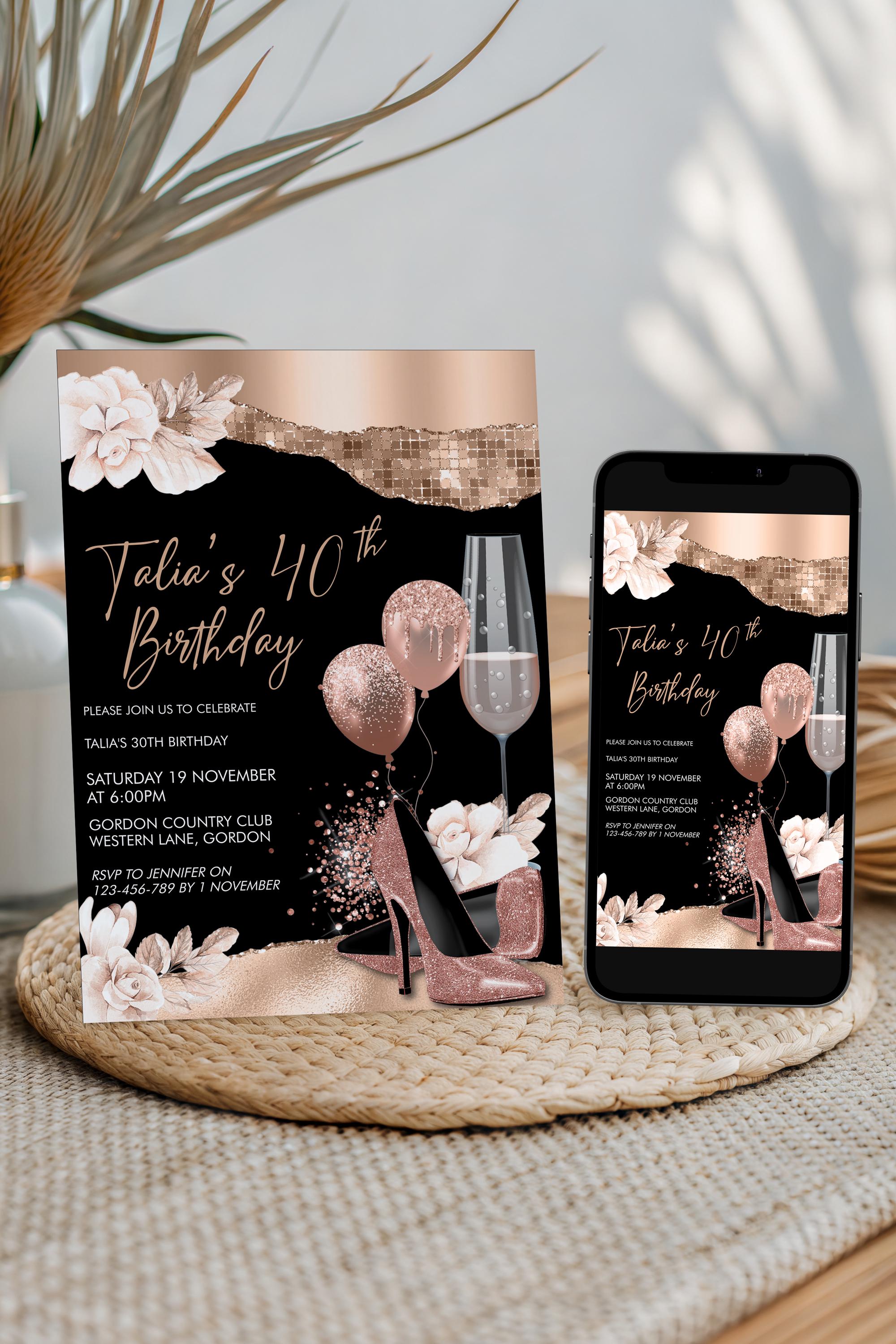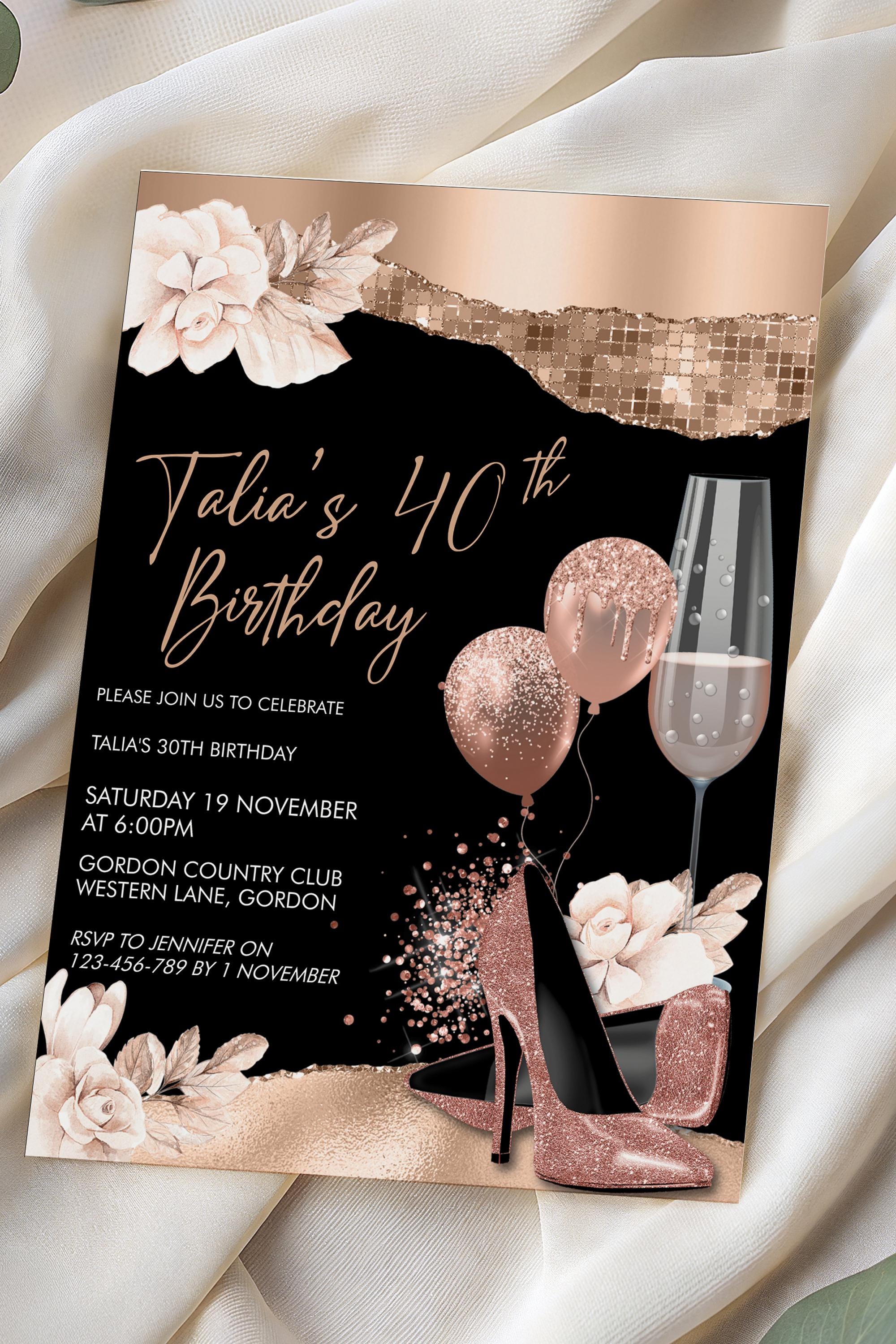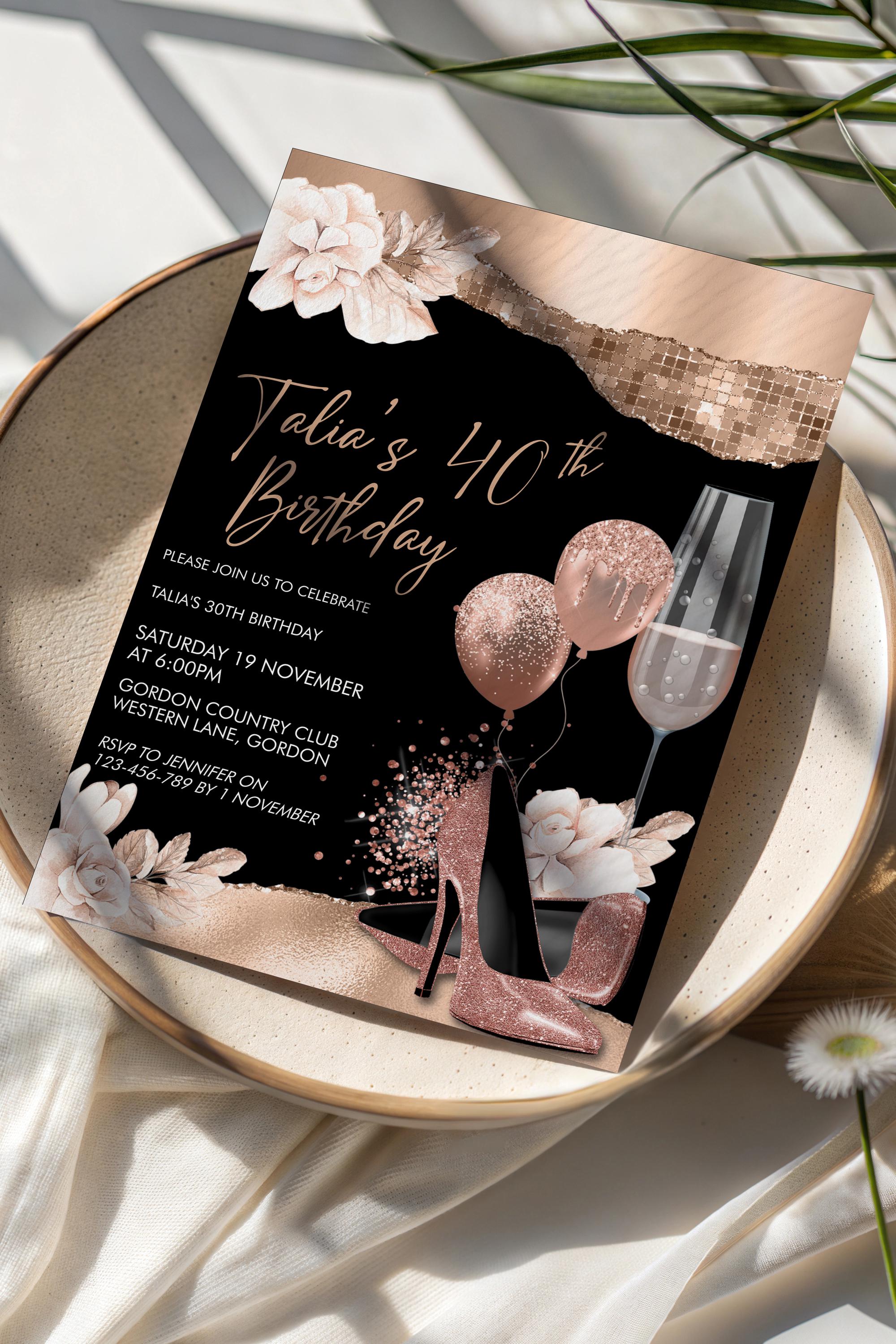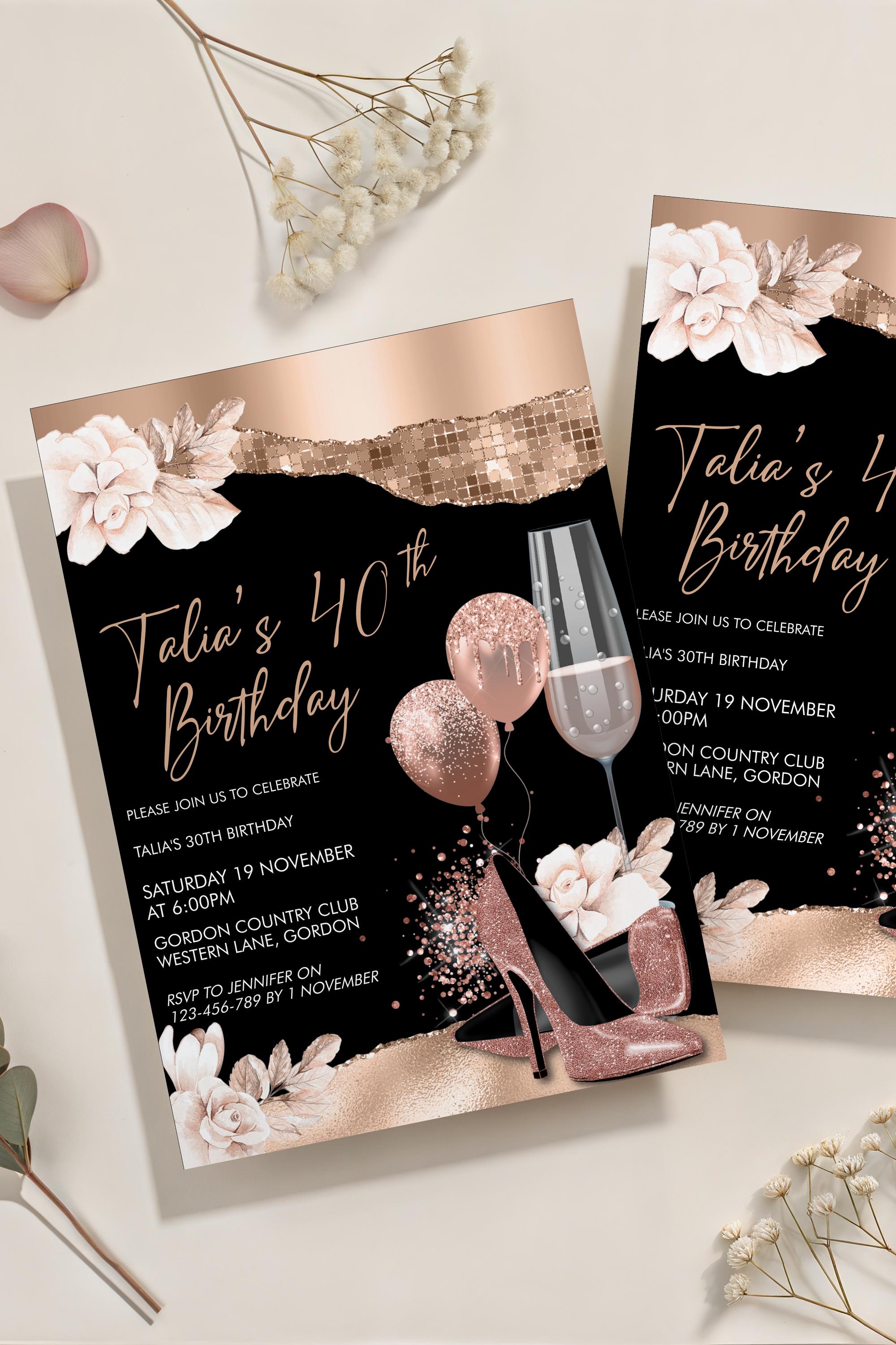 Bring a touch of heart and elegance to your celebration with this rosegold floral champagne 40th birthday invitation, designed to make a big impact in a small, meaningful way. The rich florals and rosegold glitter heels and balloons create a warm, celebratory feel that helps you stage your event beautifully — without the stress. Edit instantly in Corjl and personalize your invitation with ease, so your special day feels intentional, joyful, and effortlessly stunning.