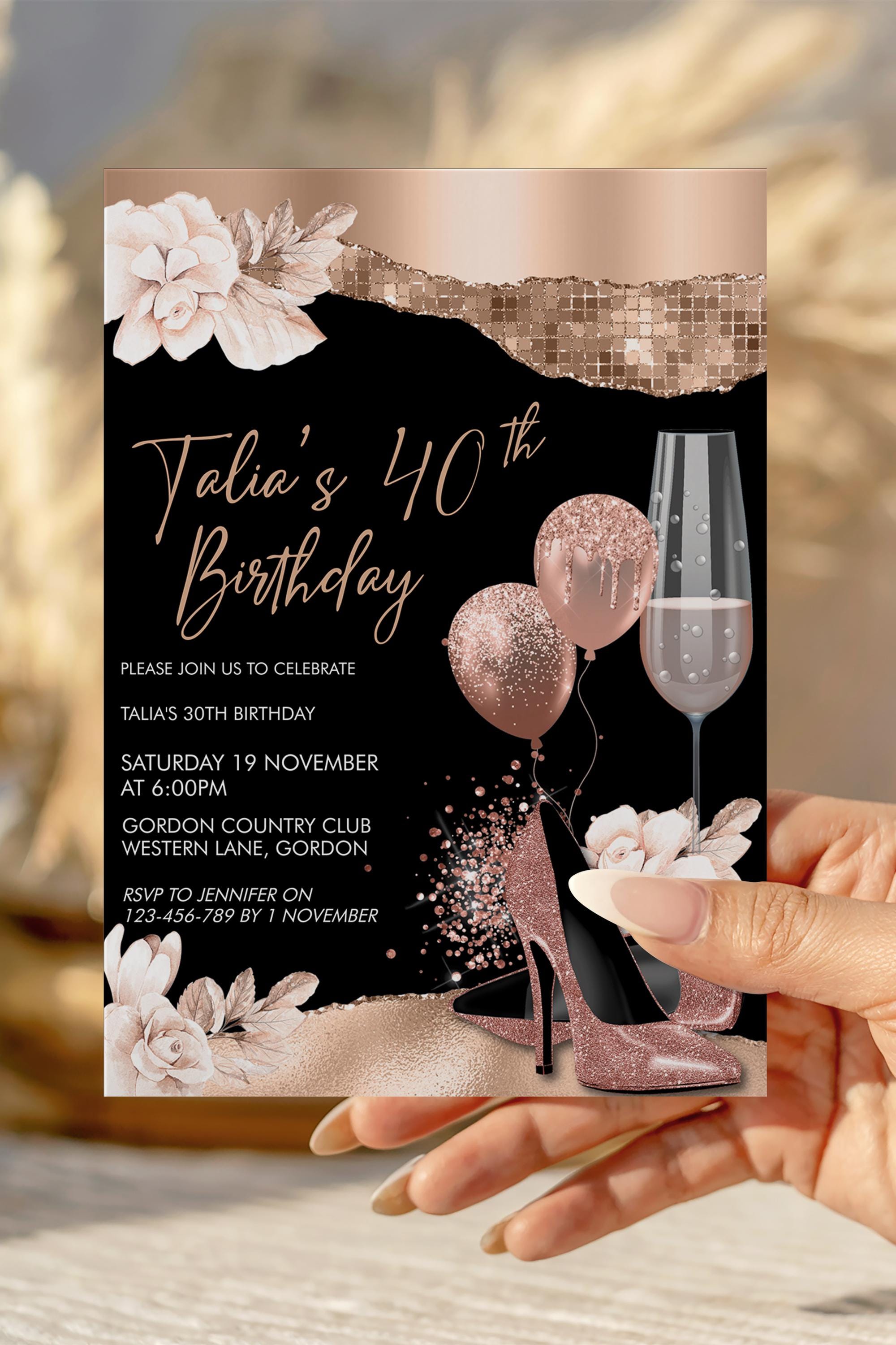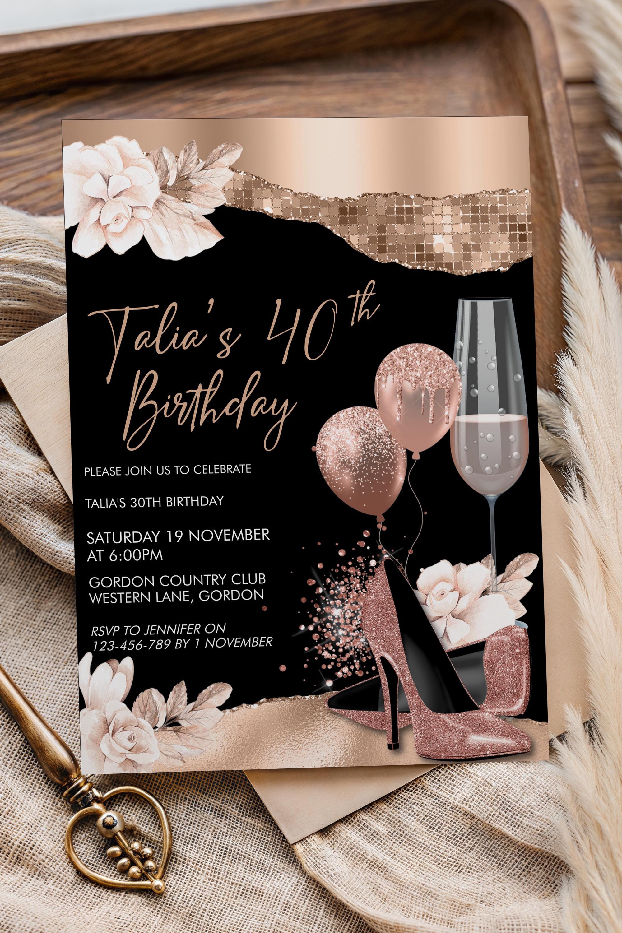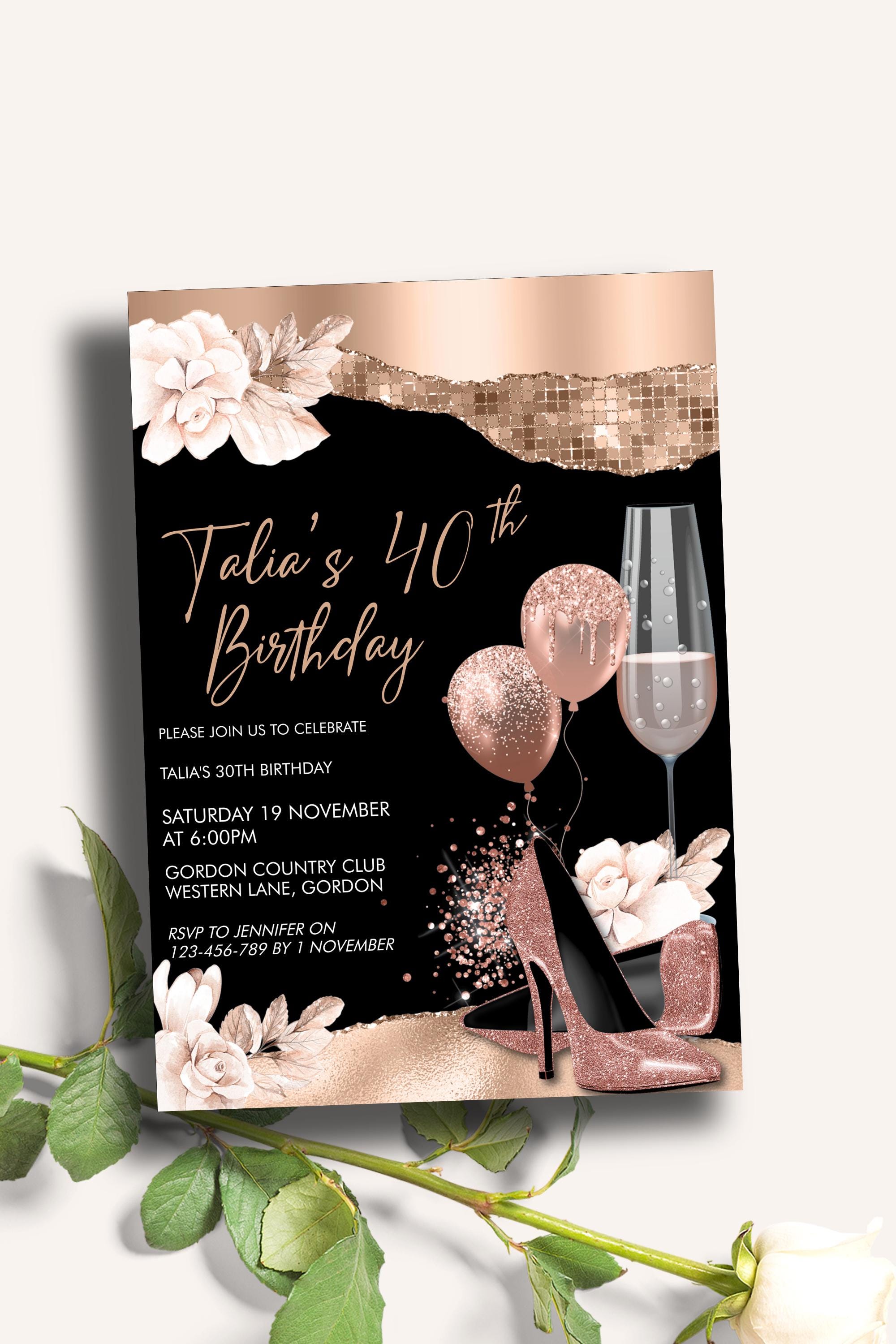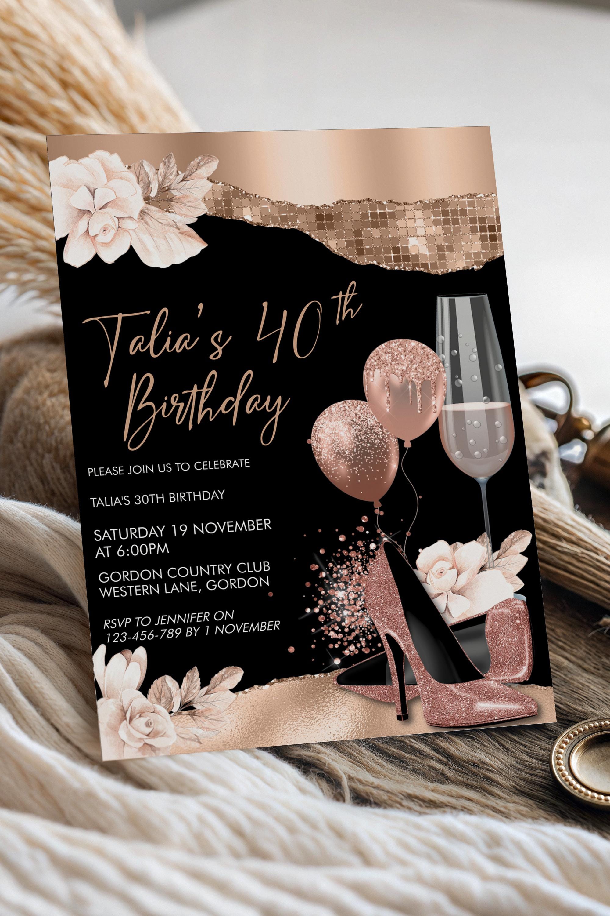 Bring a touch of heart and elegance to your celebration with this rosegold floral champagne 40th birthday invitation, designed to make a big impact in a small, meaningful way. The rich florals and rosegold glitter heels and balloons create a warm, celebratory feel that helps you stage your event beautifully — without the stress. Edit instantly in Corjl and personalize your invitation with ease, so your special day feels intentional, joyful, and effortlessly stunning.