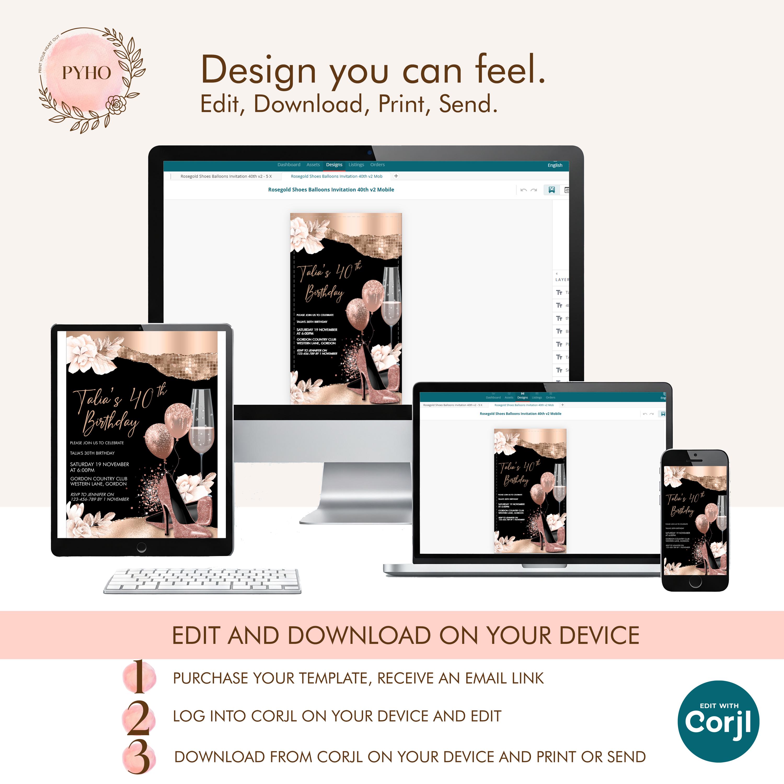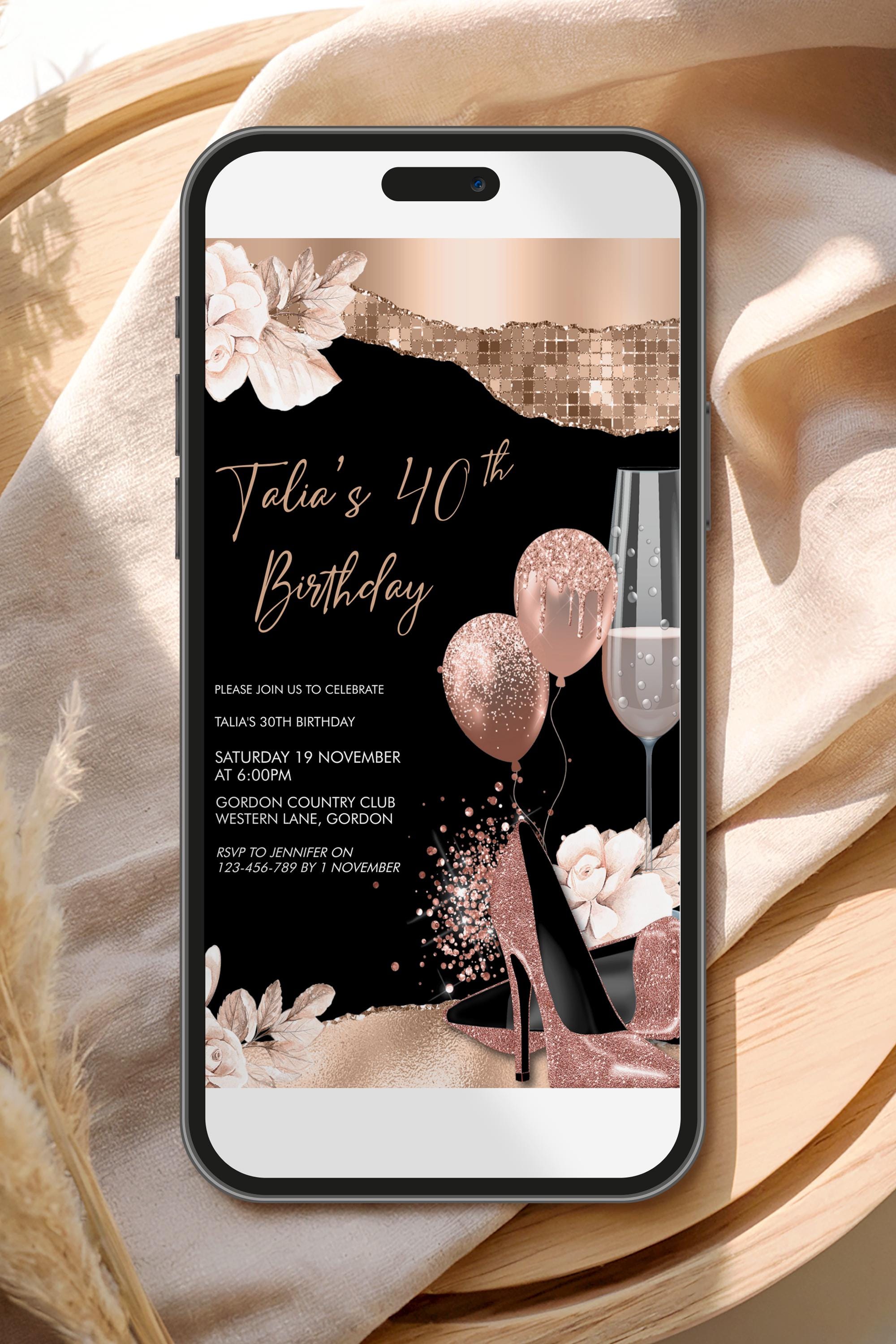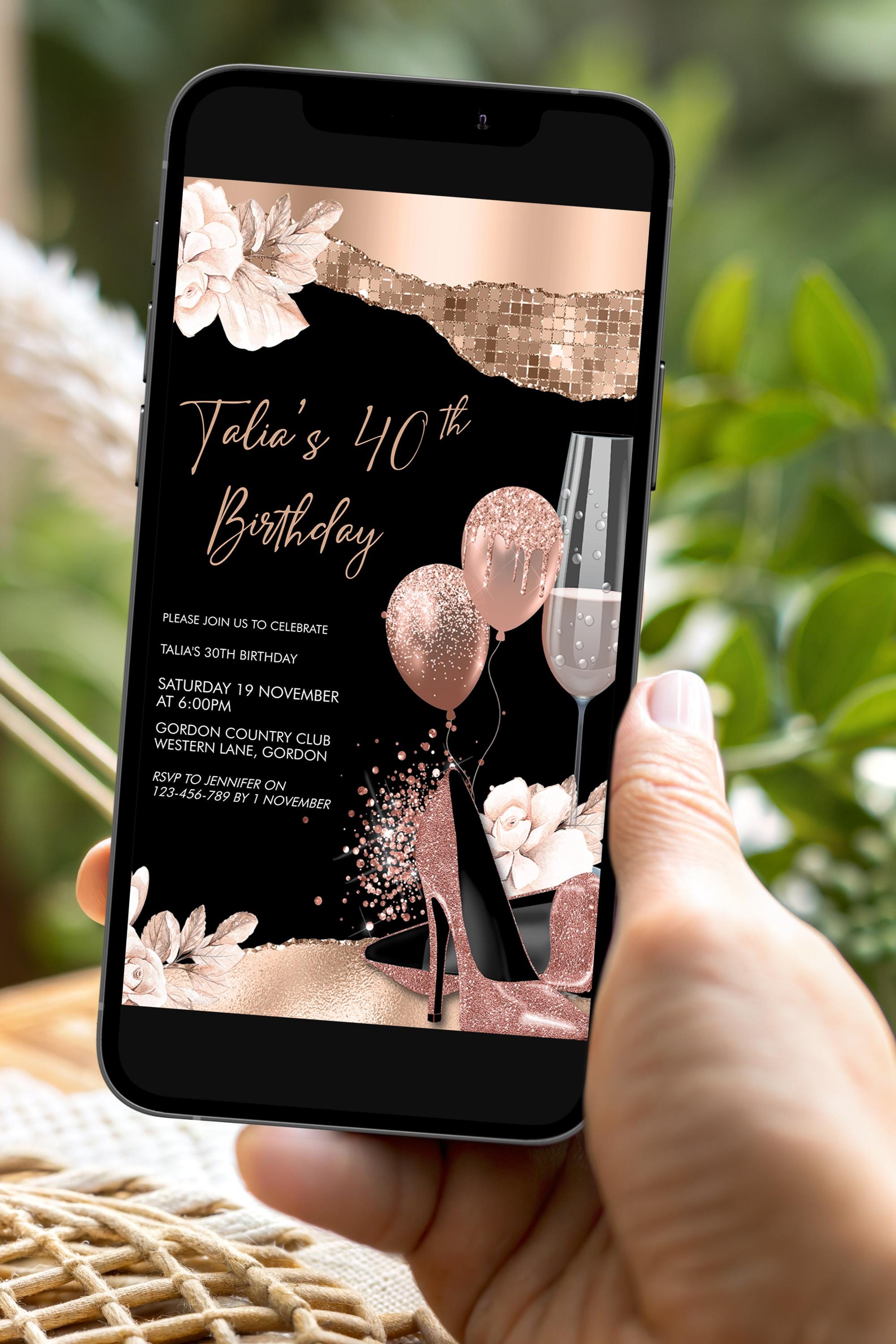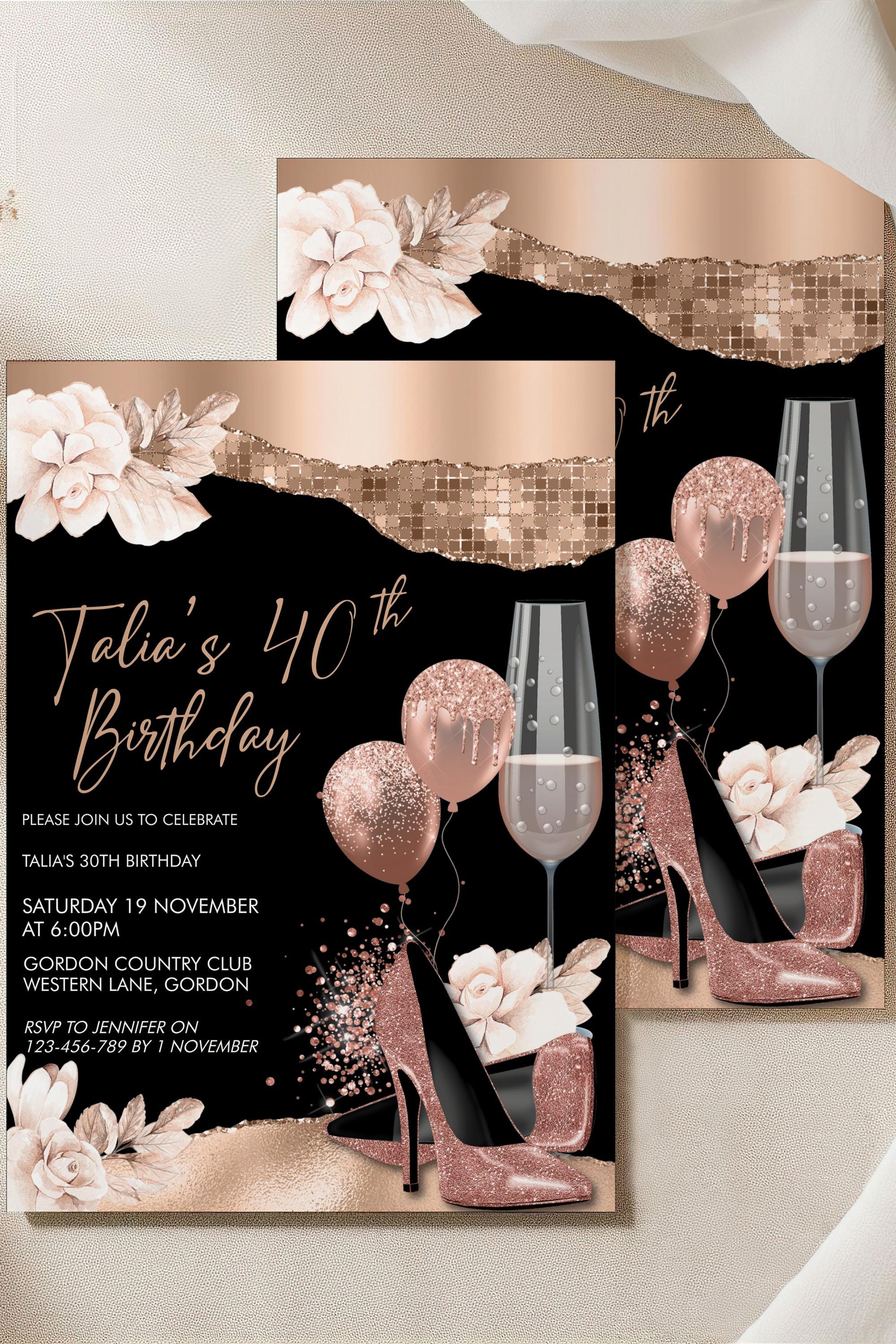Bring a touch of heart and elegance to your celebration with this rosegold floral champagne 40th birthday invitation, designed to make a big impact in a small, meaningful way. The rich florals and rosegold glitter heels and balloons create a warm, celebratory feel that helps you stage your event beautifully — without the stress. Edit instantly in Corjl and personalize your invitation with ease, so your special day feels intentional, joyful, and effortlessly stunning.