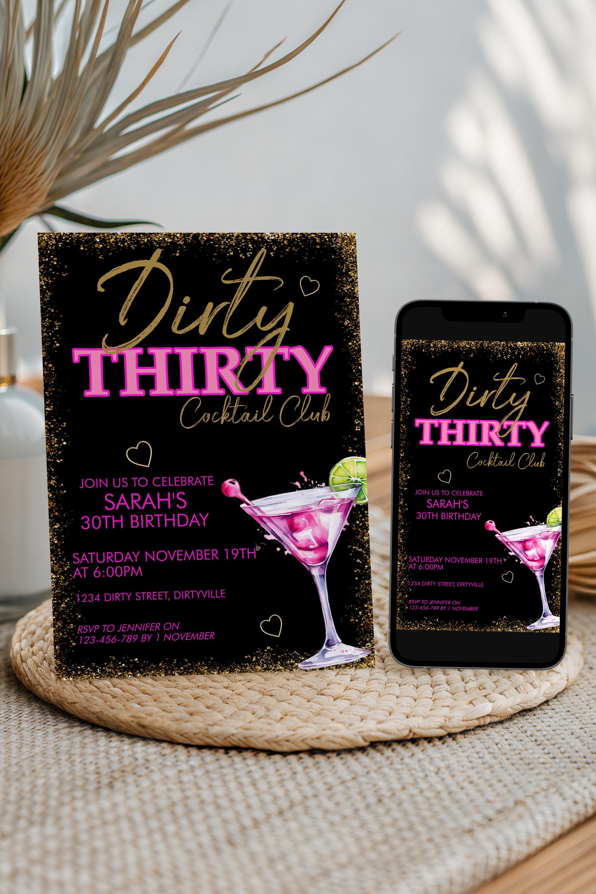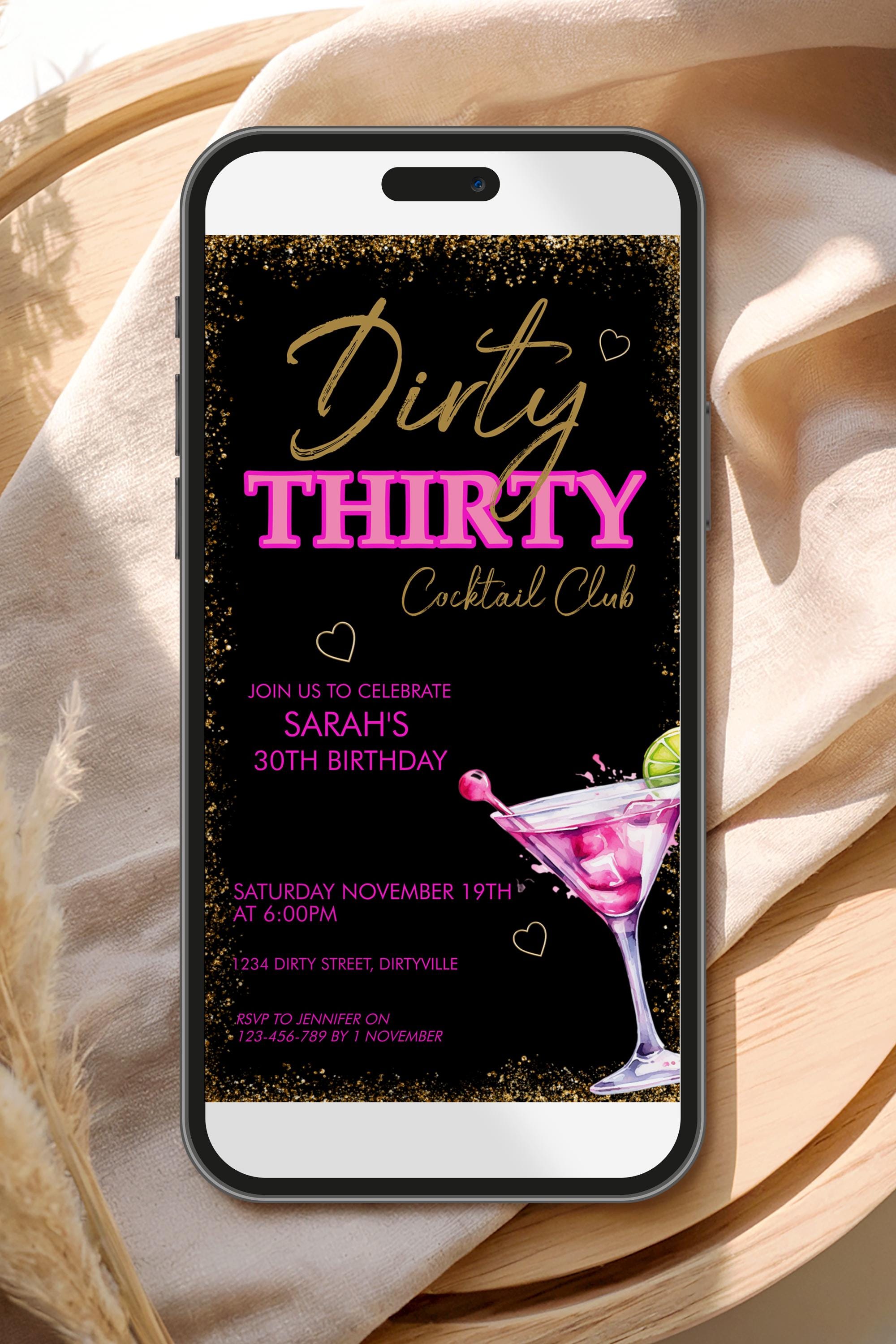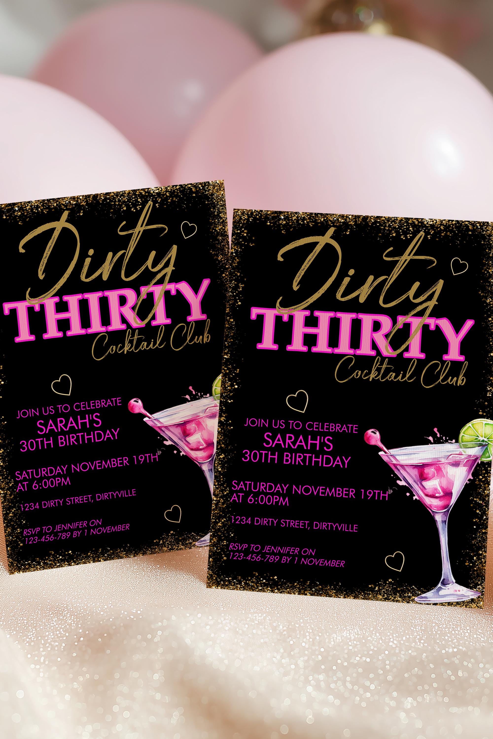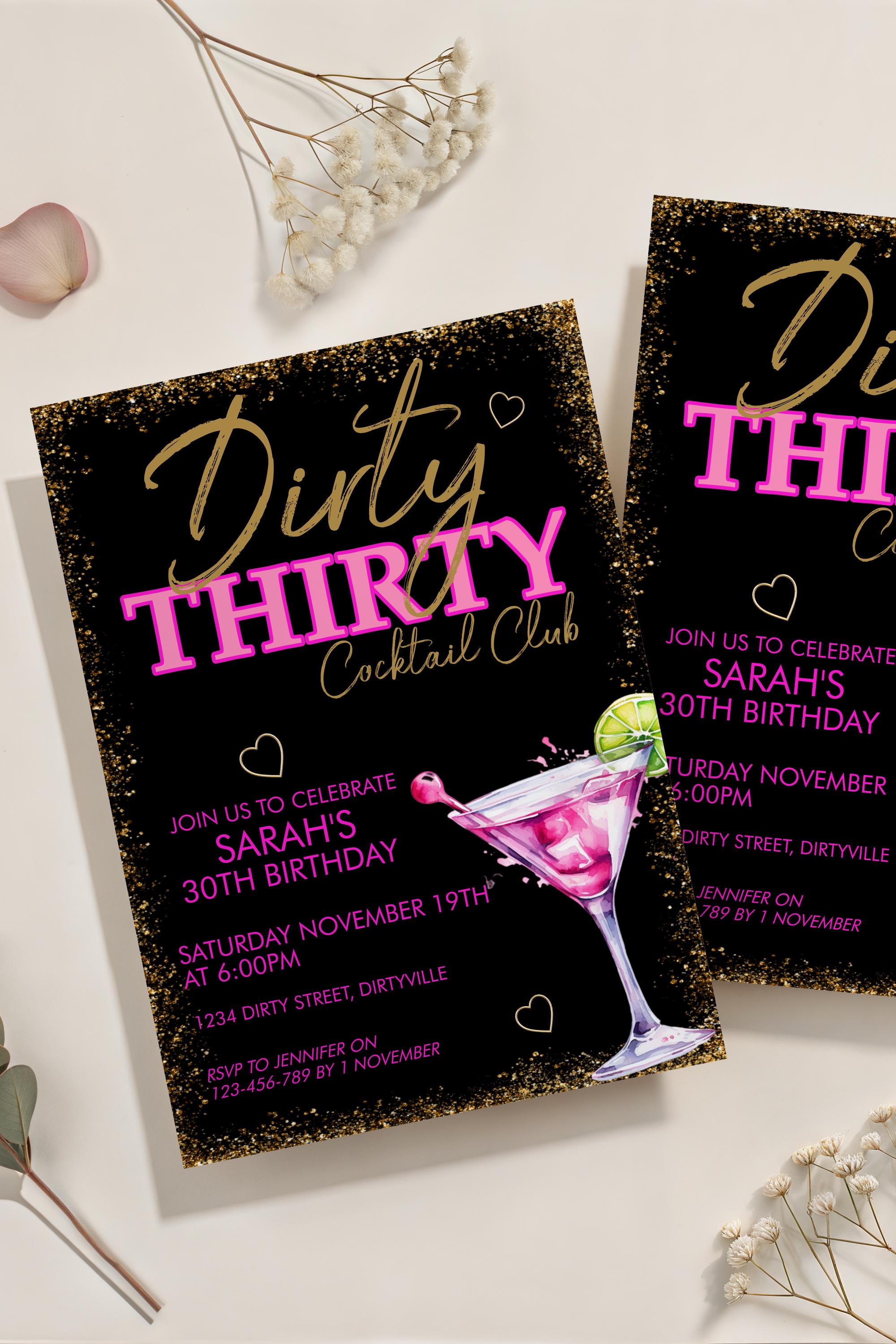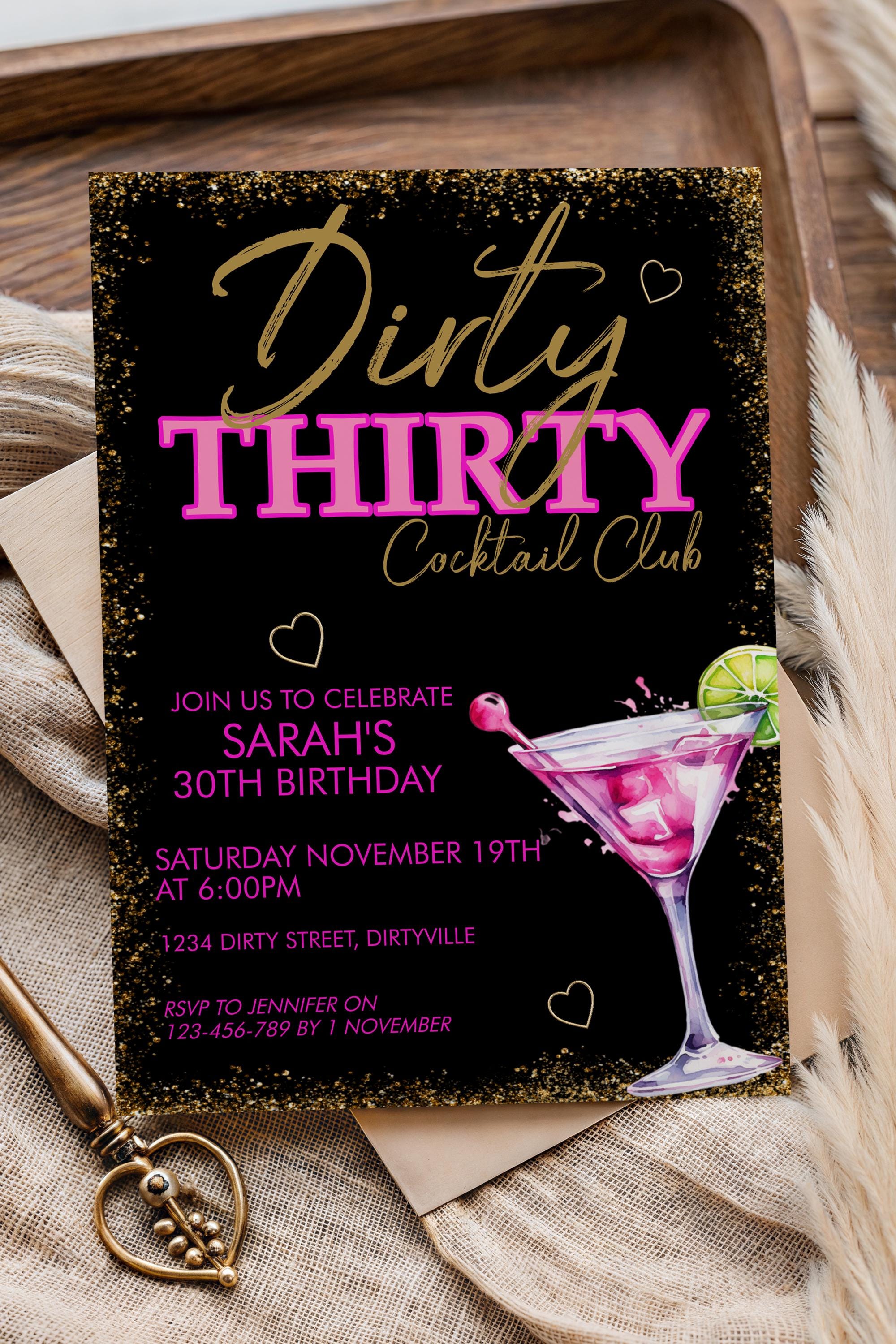 Celebrate in style with this Dirty 30 Pink Martini birthday invitation. This editable birthday template is perfect for a girl's night, cocktail party, or milestone bash. Instant download, easy to edit in Corjl.