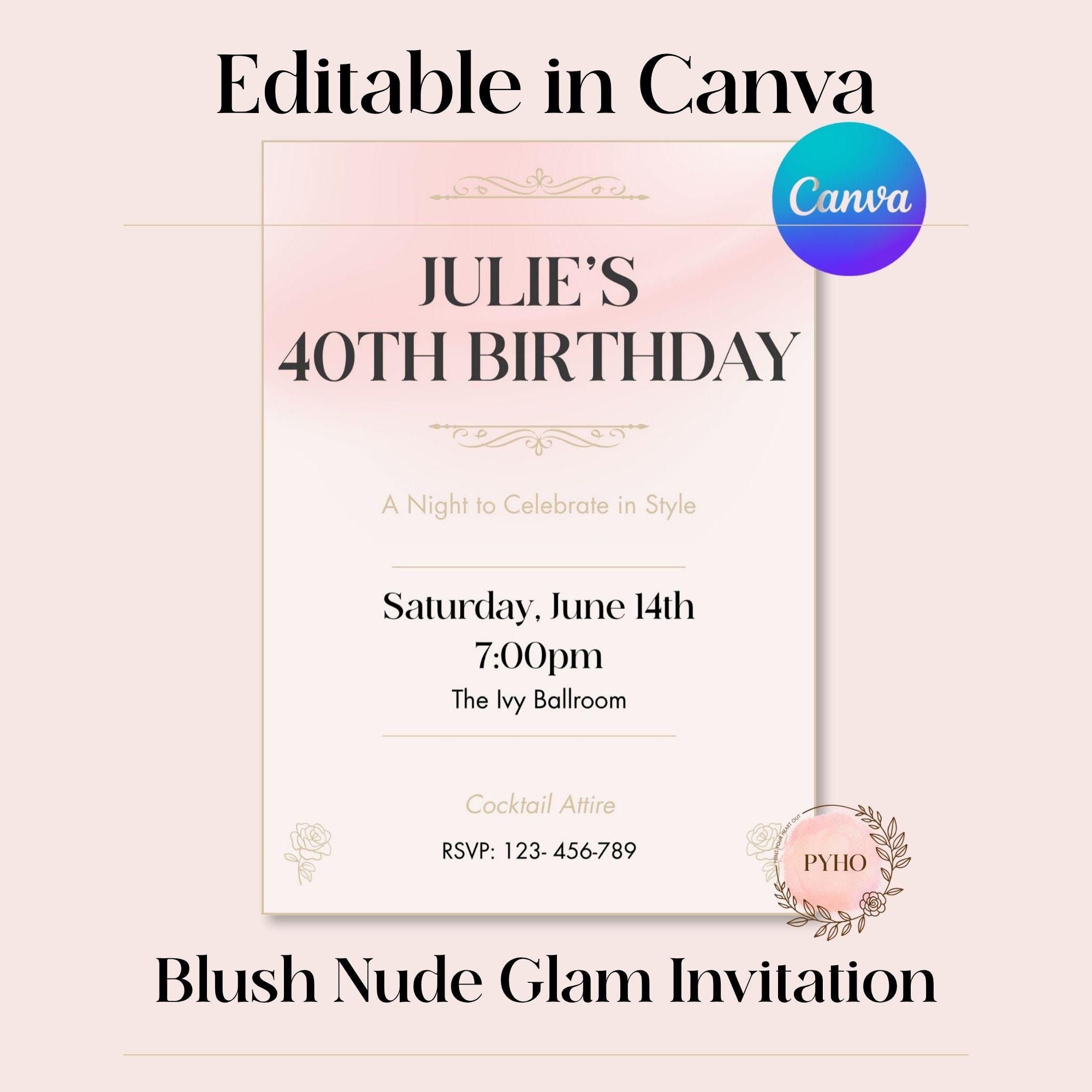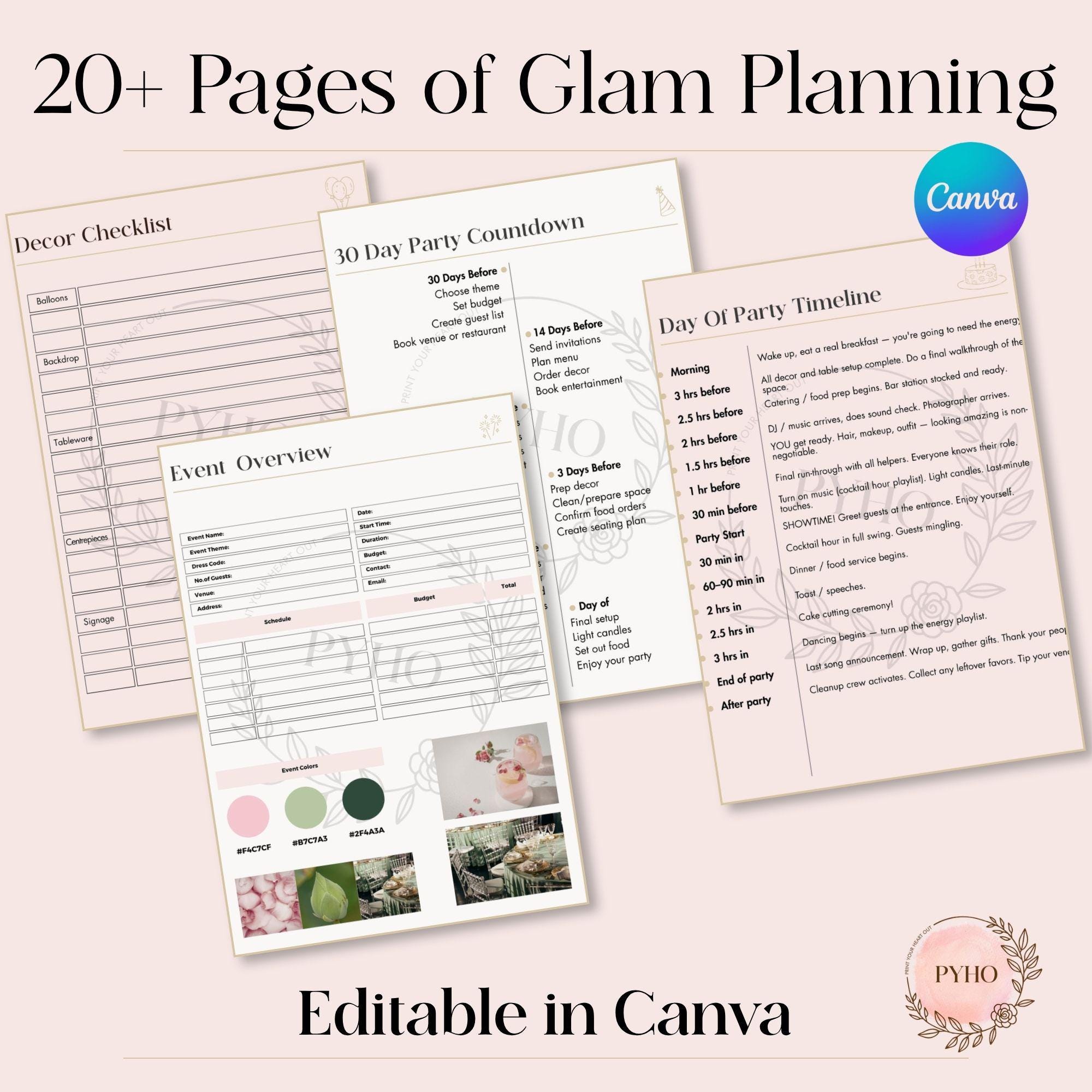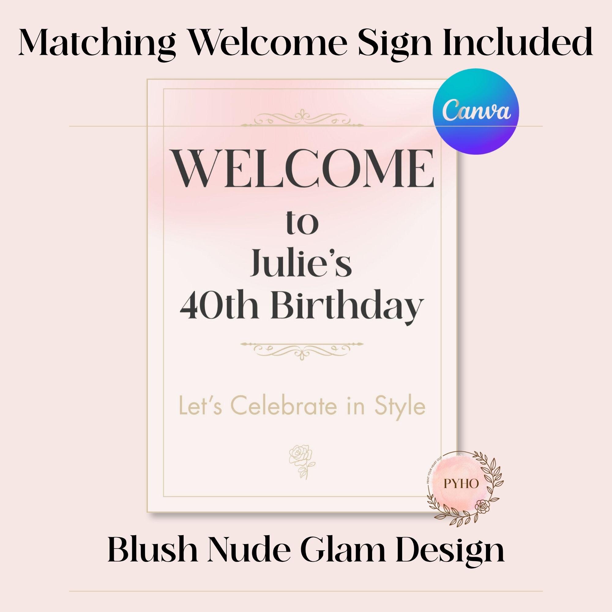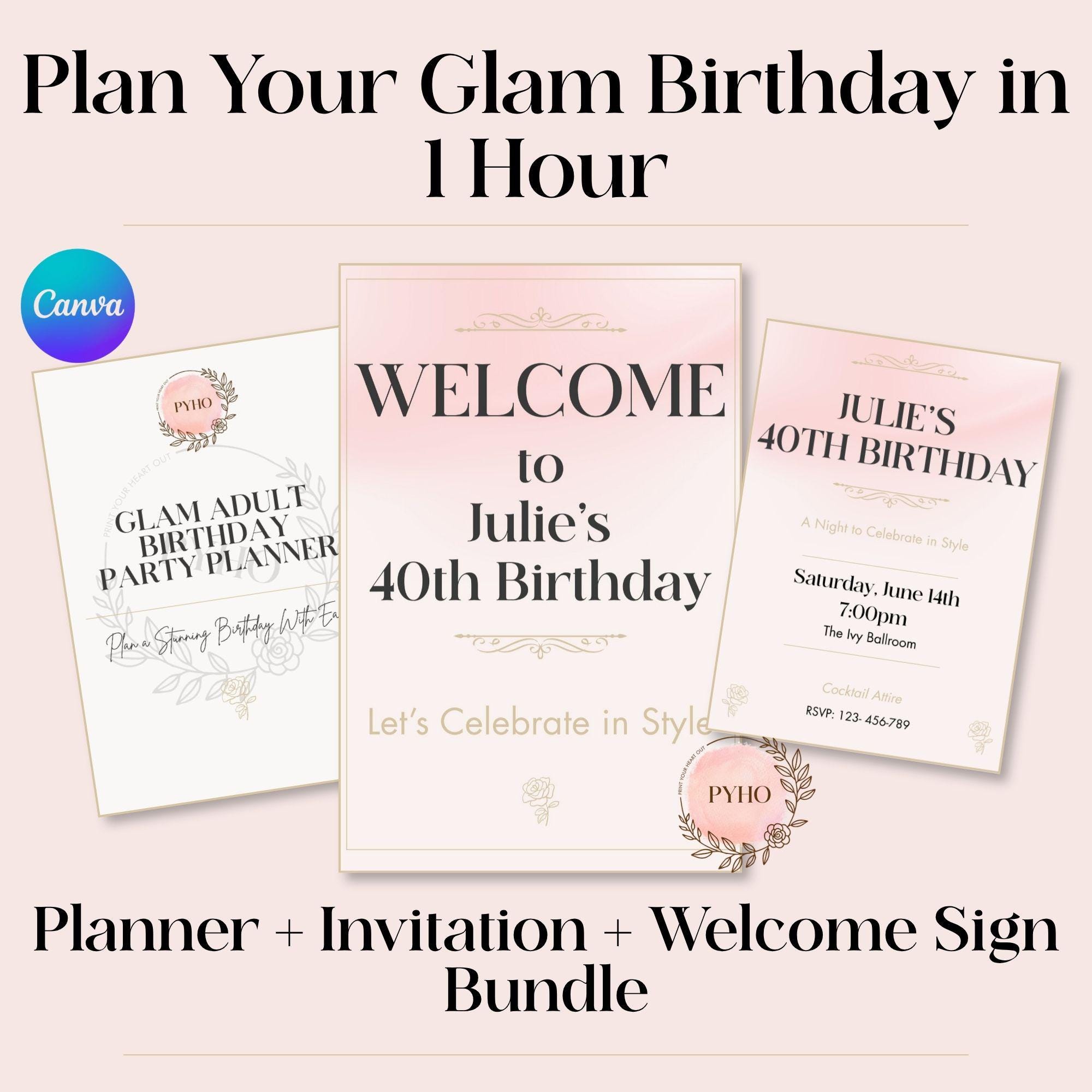 Create a stunning, coordinated birthday celebration with this Blush Nude Glam Birthday Bundle — your all‑in‑one set featuring a matching invitation, welcome sign, and 20+ page party planner, all editable in Canva.