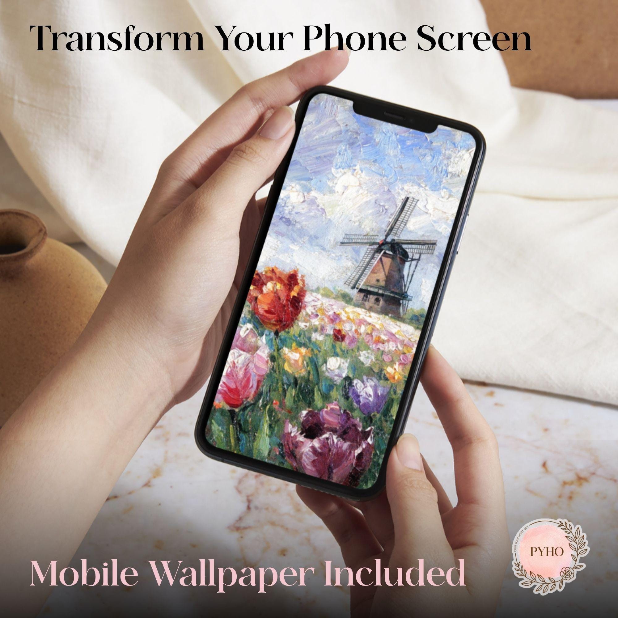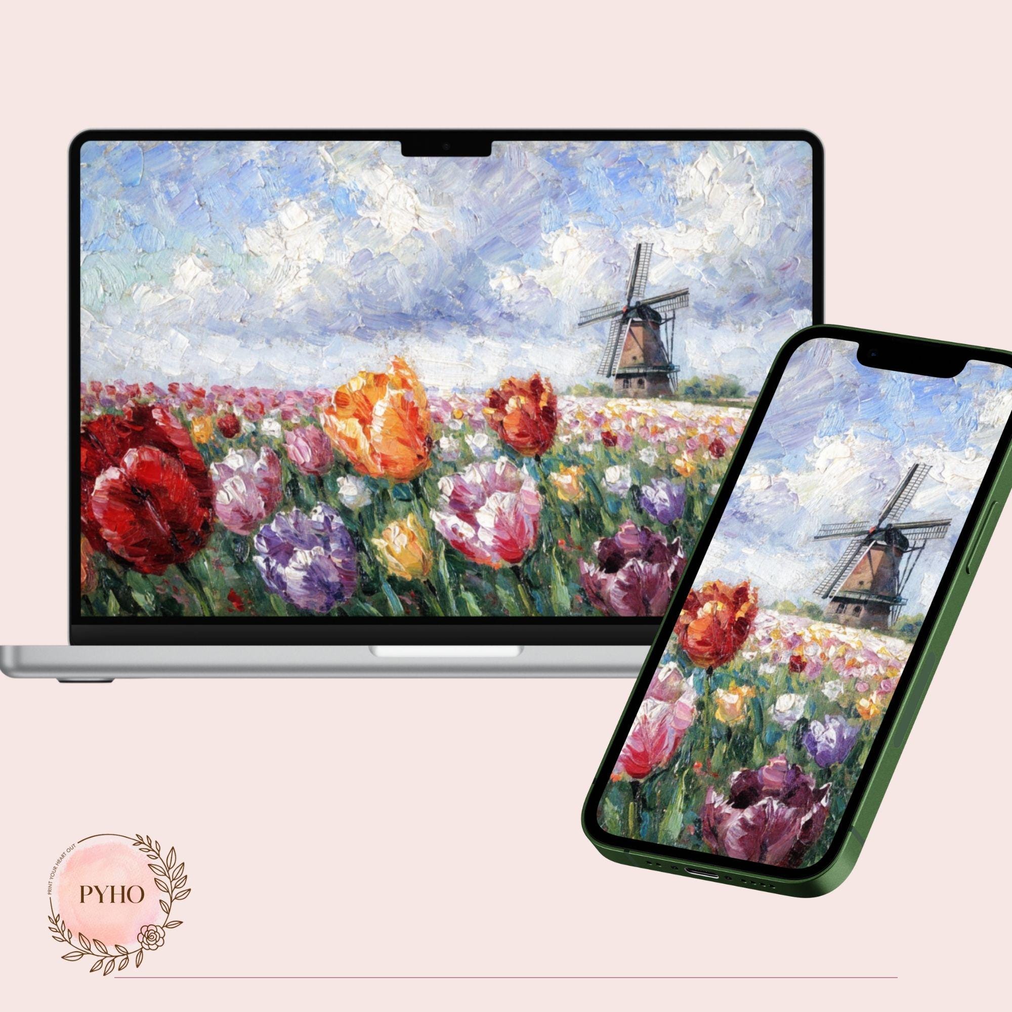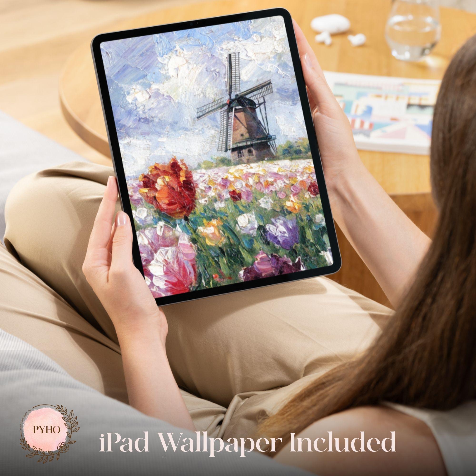 Bring a soft, artistic touch to your devices with this botanical oil painting-inspired digital pack, featuring a peaceful tulip field and windmill landscape design.