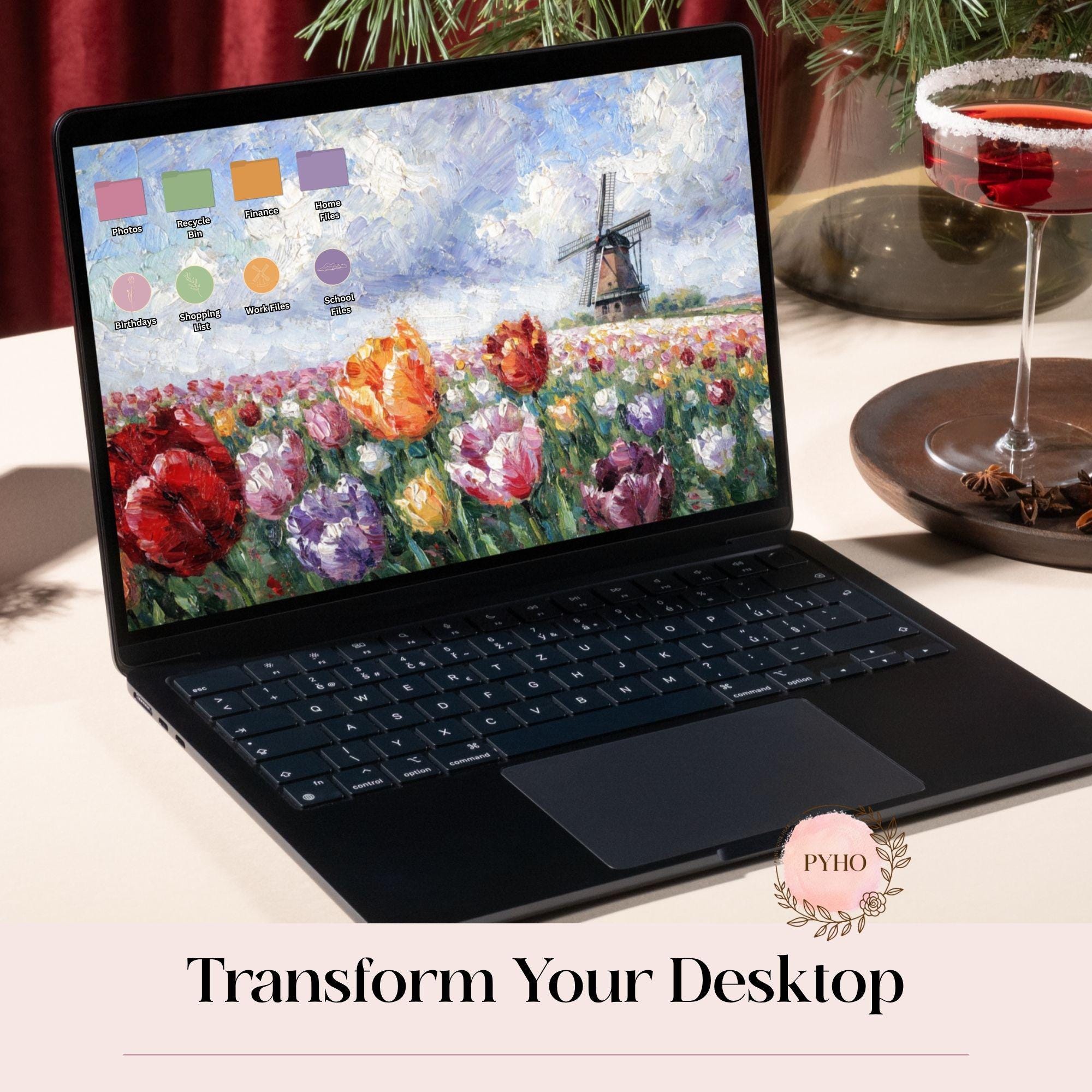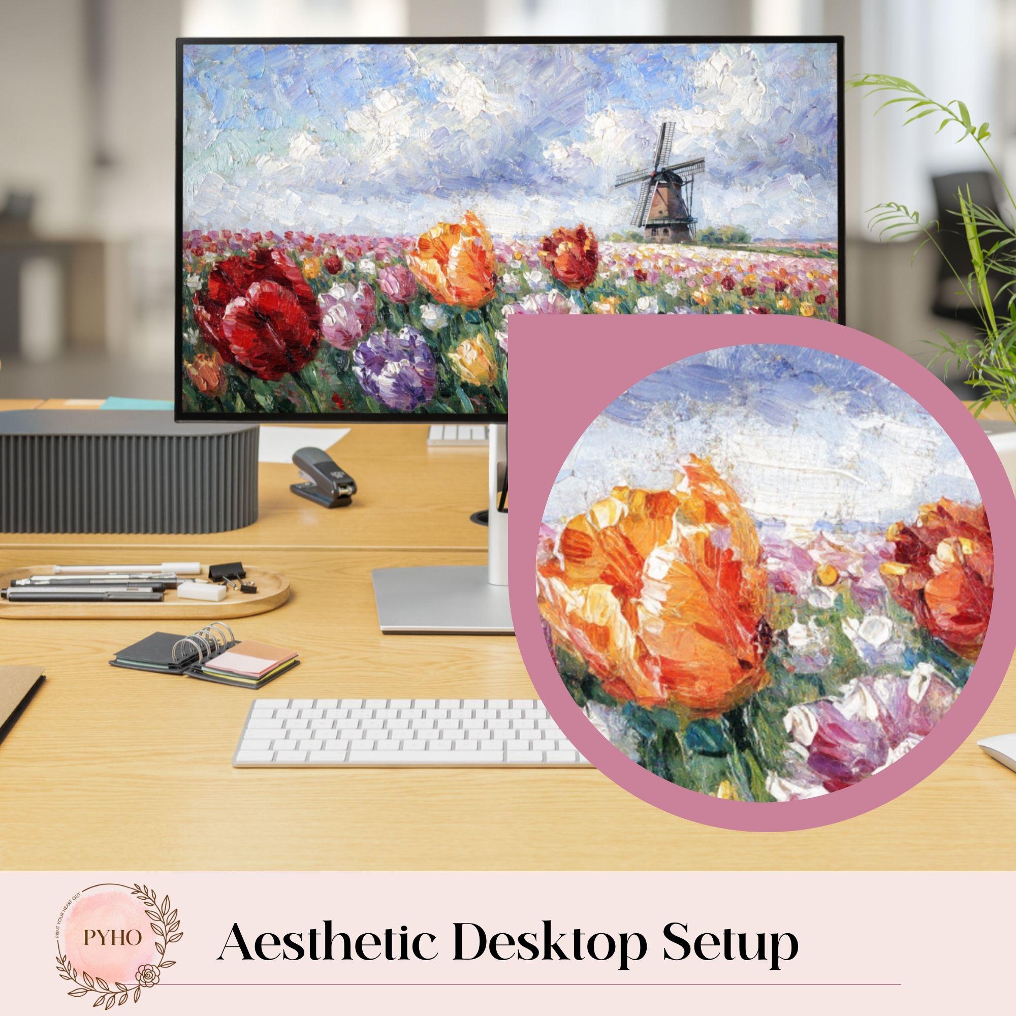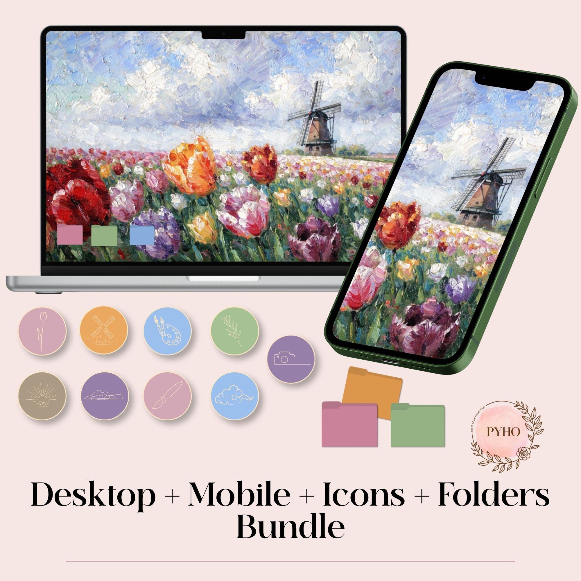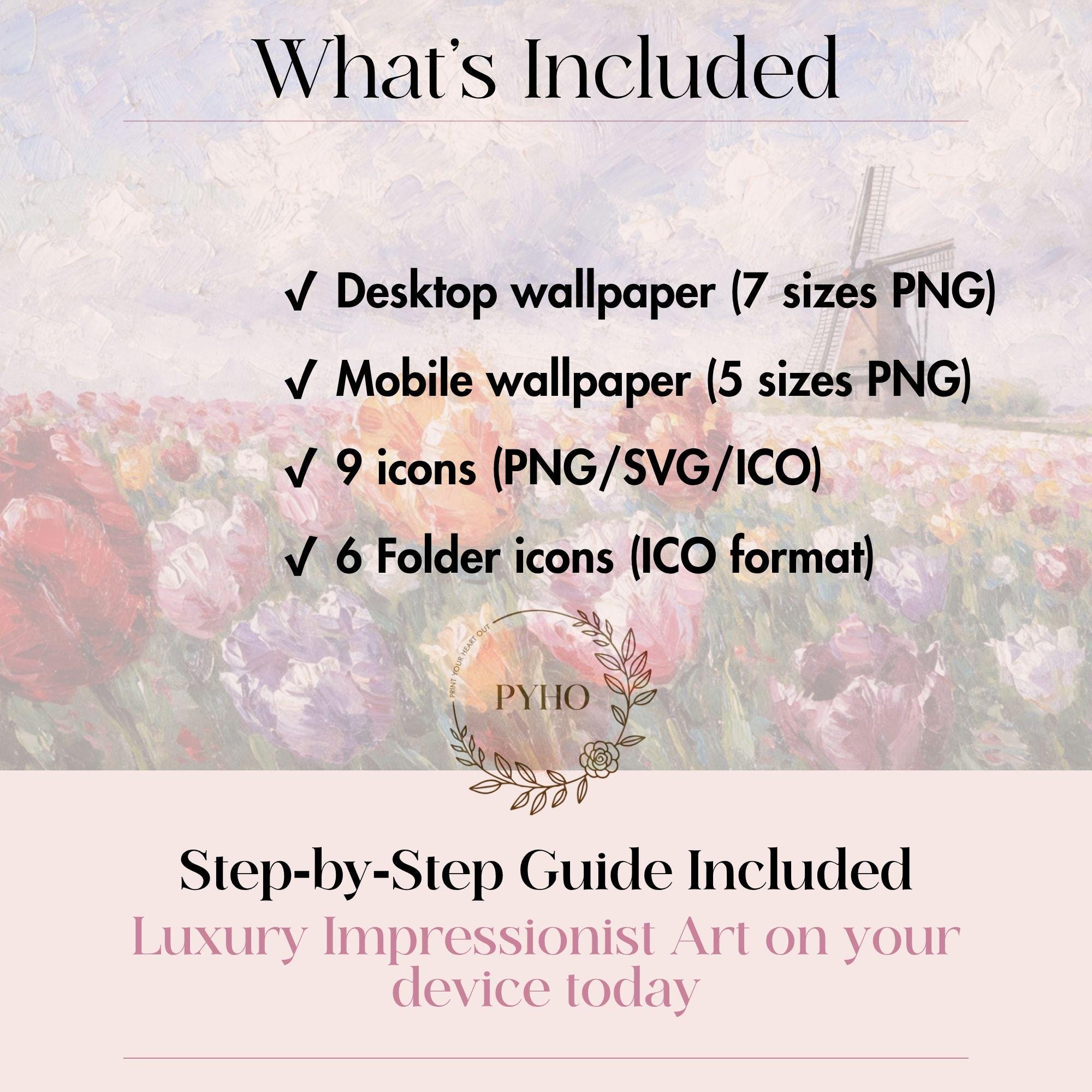 Bring a soft, artistic touch to your devices with this botanical oil painting-inspired digital pack, featuring a peaceful tulip field and windmill landscape design.
