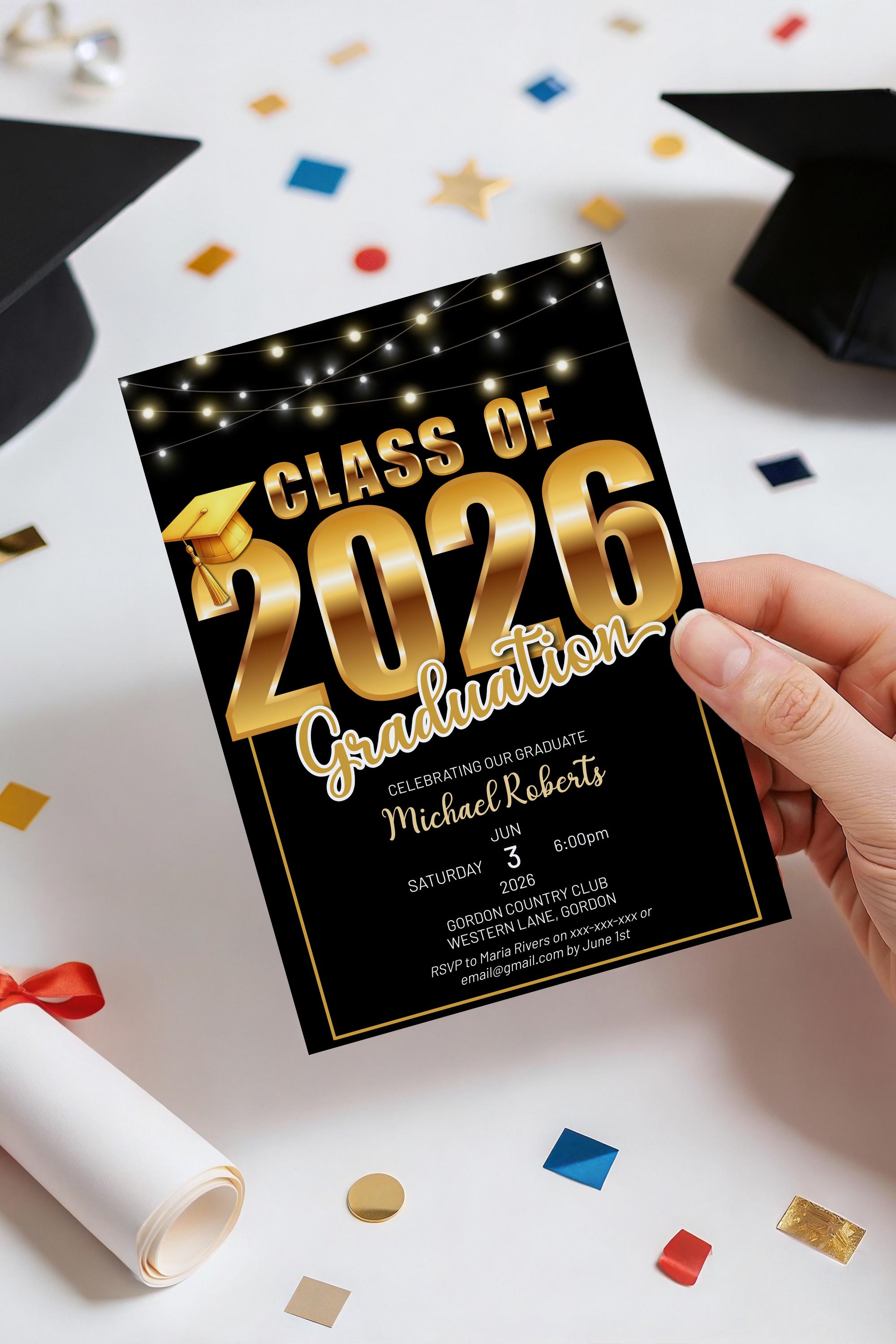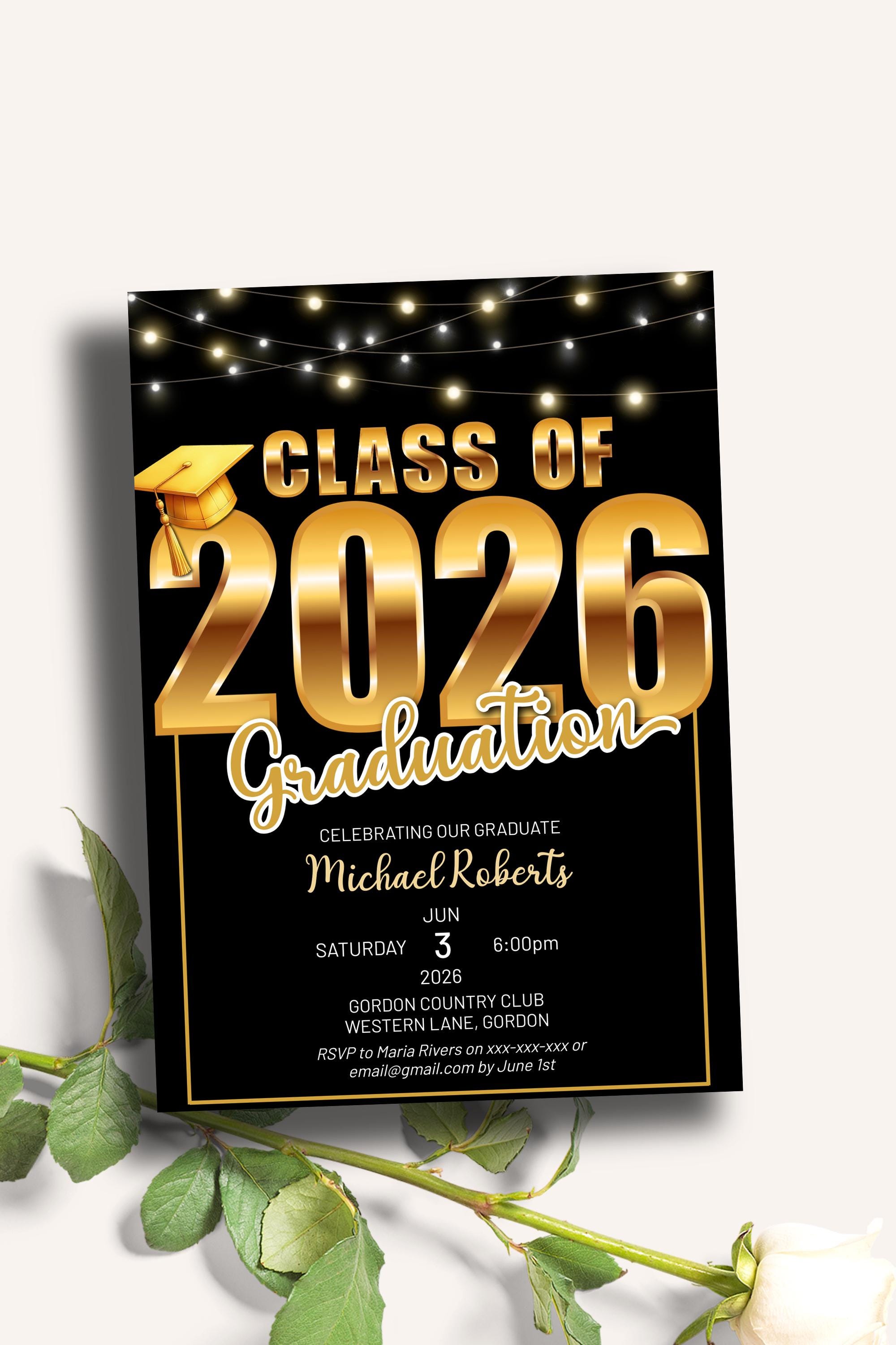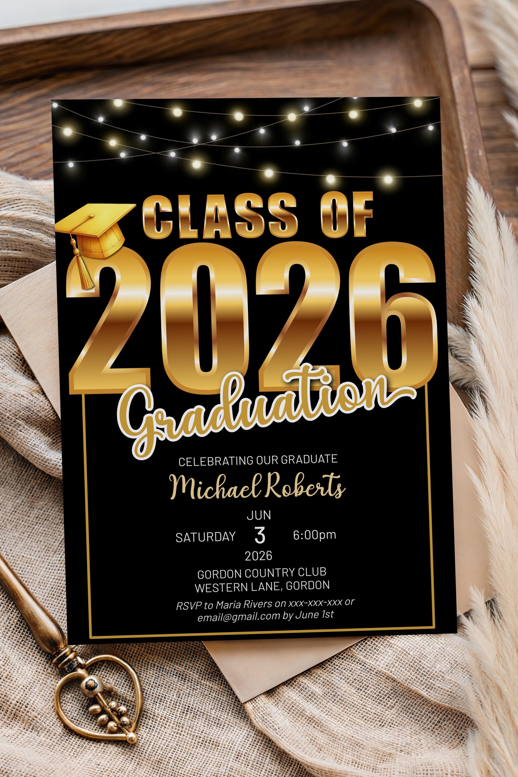 Celebrate your graduate’s big moment with a modern, stylish Class of 2026 graduation invitation designed to feel polished, personal, and effortlessly impressive. This editable template makes it easy to create a beautiful announcement without the stress — simply customize, download, and share.