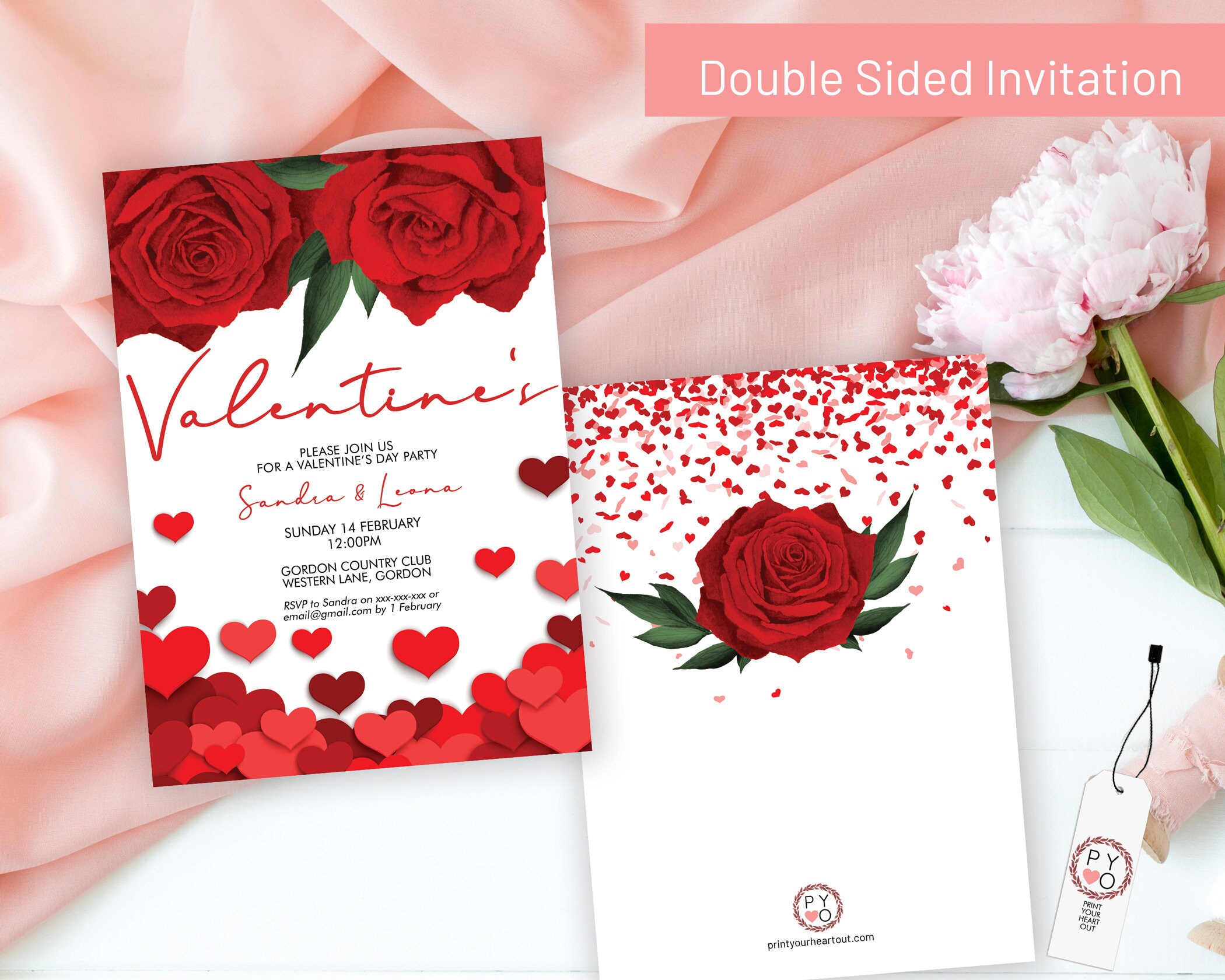 Red Roses Valentine's Day Party Invitation, Red Sweetheart Invitation, Romantic Floral Valentine Invite, Valentine Heart Flyer, Friend Party, Double Sided Invitation