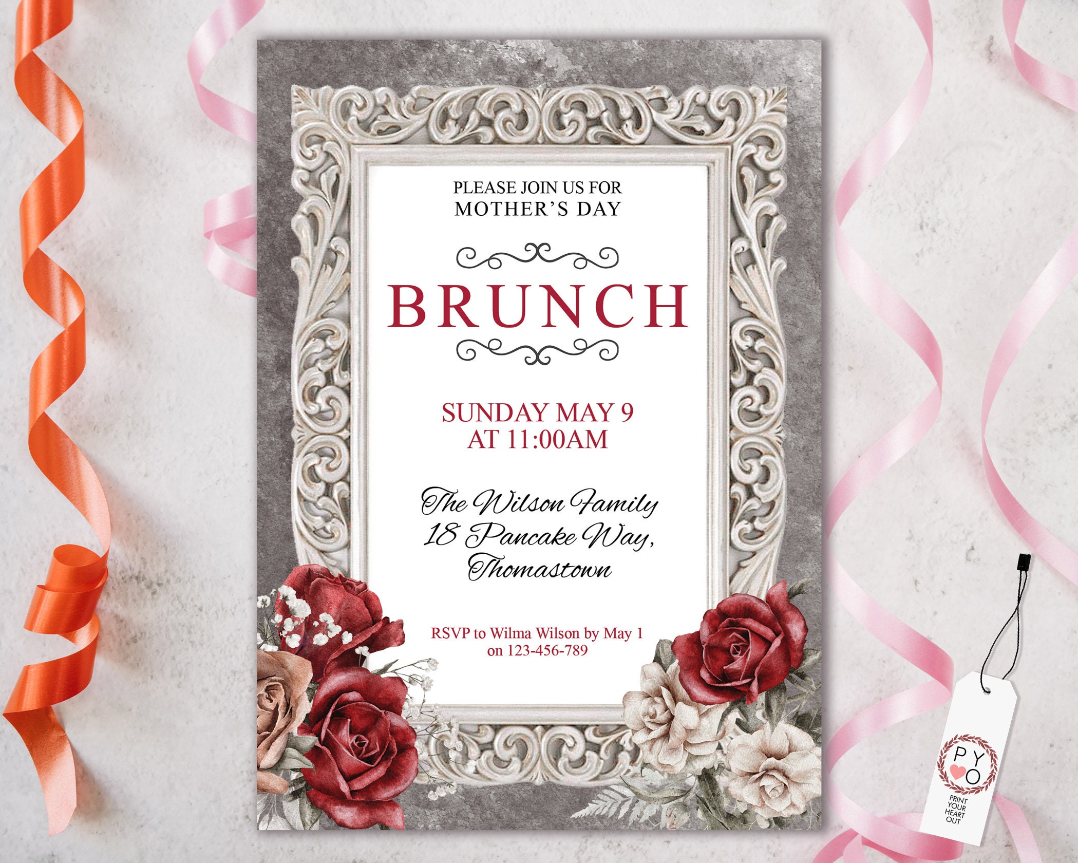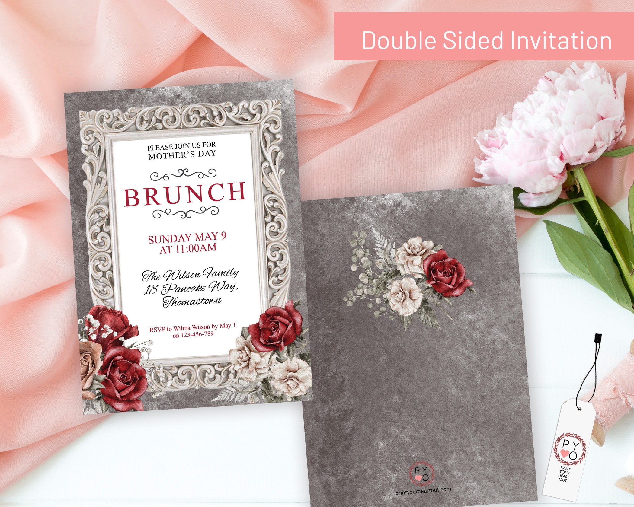 Mother's Day Brunch Red Rose Floral Invitation Printable Template, Ivory Grey Editable Dinner Invite for Mom, Printable Gray Cream Flowers, Double Sided Invitation